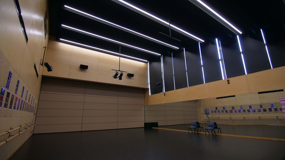 Our dance studio is a hub of expressive movement. It can be divided into two acoustically separate teaching spaces and has the capacity to host performances The downstairs multi-purpose dance activity room features a cushioned floor to practise more complex movements in safety.