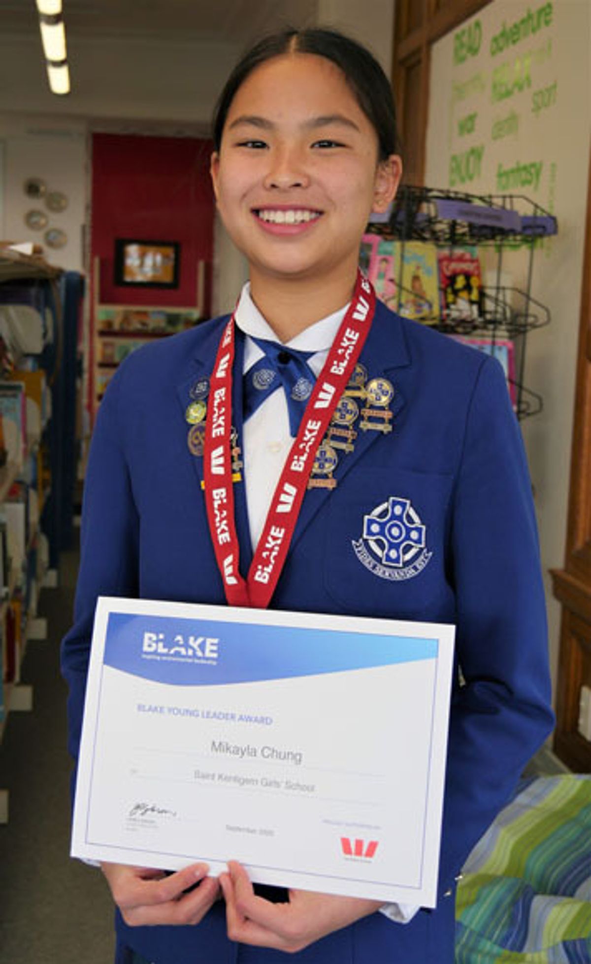 In a special awards ceremony this morning, Girls’ School Principal, Ms Juliet Small awarded Head Girl, Mikayla Chung with the 2020 BLAKE Young Leader Award. This prestigious award is presented to students all around the country who show great leadership in making a positive change towards a better future for our communities and our planet earth.