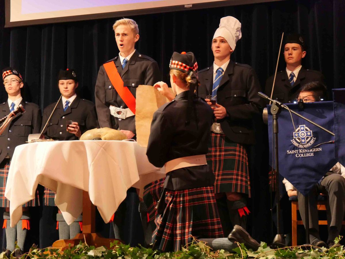 Prior to dinner, our drummers stepped up to the front to give an amazing display of precision drumming before the guests were all upstanding and their glasses charged as the haggis was piped in, addressed and toasted. This year, Year 12 student, Fraser McEwen gave a brilliantly animated recitation of Robbie Burns’ ‘Ode to the Haggis’ before said haggis was placed on the dinner table for all to try. The annual Haggis aficionados’ discussion then got underway with this year’s ‘brew’ passing muster!