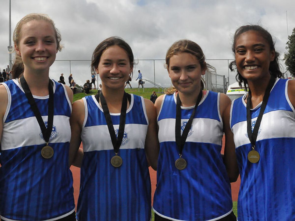 Around 40 College students competed at the Auckland Athletics Championships at Mt Smart Stadium yesterday with great success. The students hauled in 20 medals, including seven gold, and a record that had stood for 33 years was smashed by our Intermediate Girls relay team - Lisa Putt, Jaymie Kolose, Briana Gibson, Cecile Velghe. The previous record was 50.64 and the girls ran 50.60 for the new record.