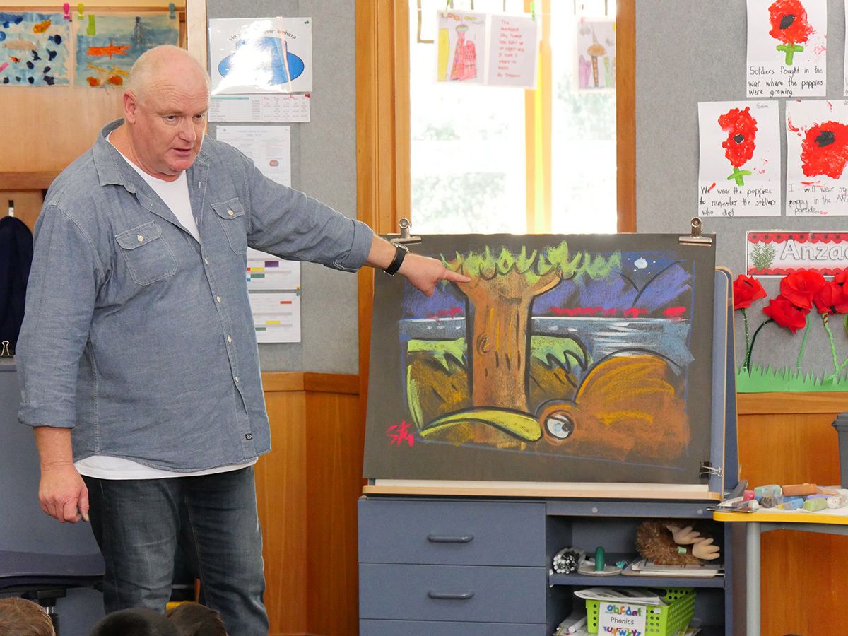 Today, he did three separate shows for the Junior, Middle and Senior syndicates with each tale age-appropriate. His signature chalk on black illustrations grew as the chalk flew across the paper, the finished three art works left for the School to display.