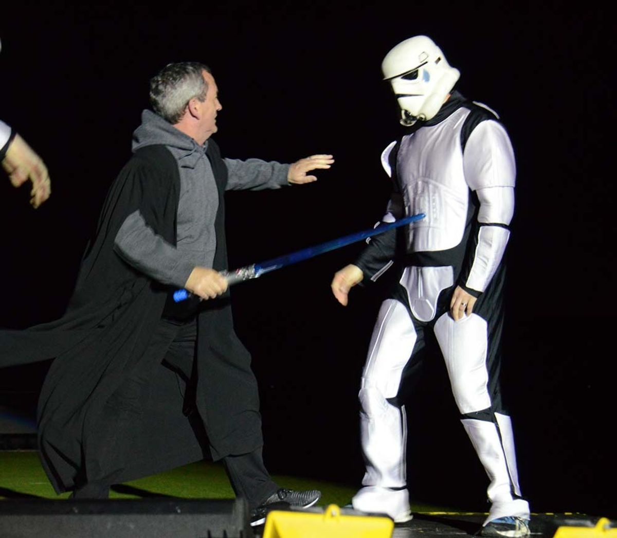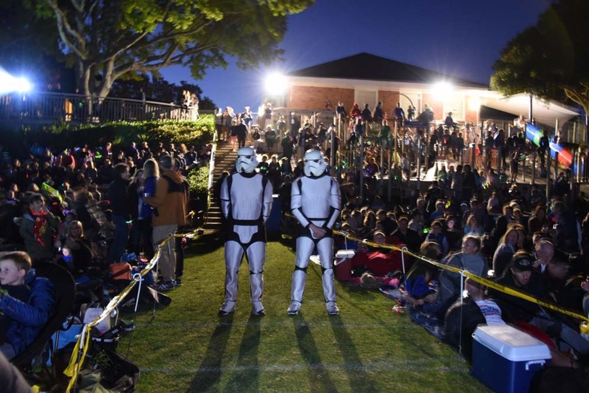 It was then left to Mr Cassie to welcome the large gathering of families as they settled back for the main event…with one slight space-opera twist, as in true Star Wars style, Storm Troopers climbed onto the stage, along with Lord Reuben Vader (Rev. Hardie) and Princess Leia Small (Girls’ School Principal, Ms Juliet Small). The ensuing light sabre battle saved the event, letting Hans Solo (pre-chosen winner, Year 5 student, Ethan Knox) press the plunger to start the show. Wow, what a show as the Battle in the Stars raged into action, lighting up the sky directly overhead!