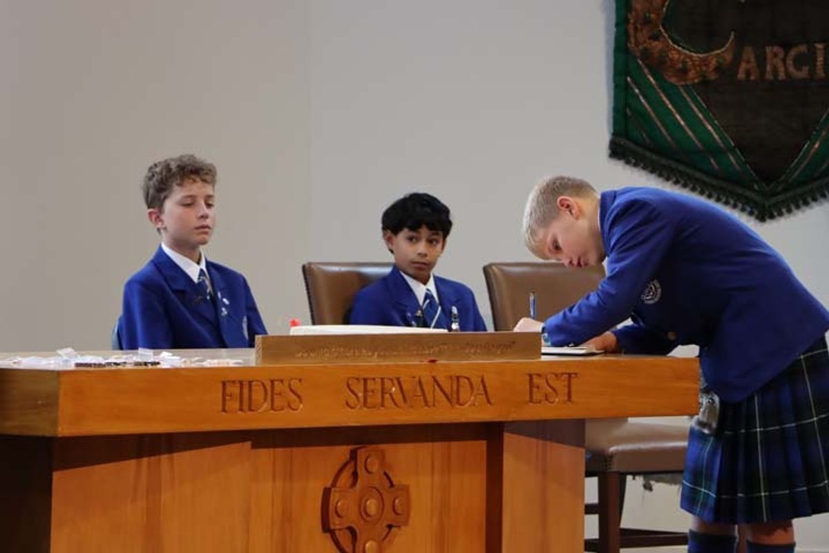 Mr Cassie came forward to challenge both Isaac and Jack with the Prefect Pledge: ‘Gentlemen, do you promise to uphold the values and standards of Saint Kentigern School and to serve its students, teachers and parents to the best of your ability and for the glory of God?’ The boys signed the Prefect Ledger, first started in 1995, then introduced the rest of their prefect team to the School, as they in turn accepted the duties of leadership.