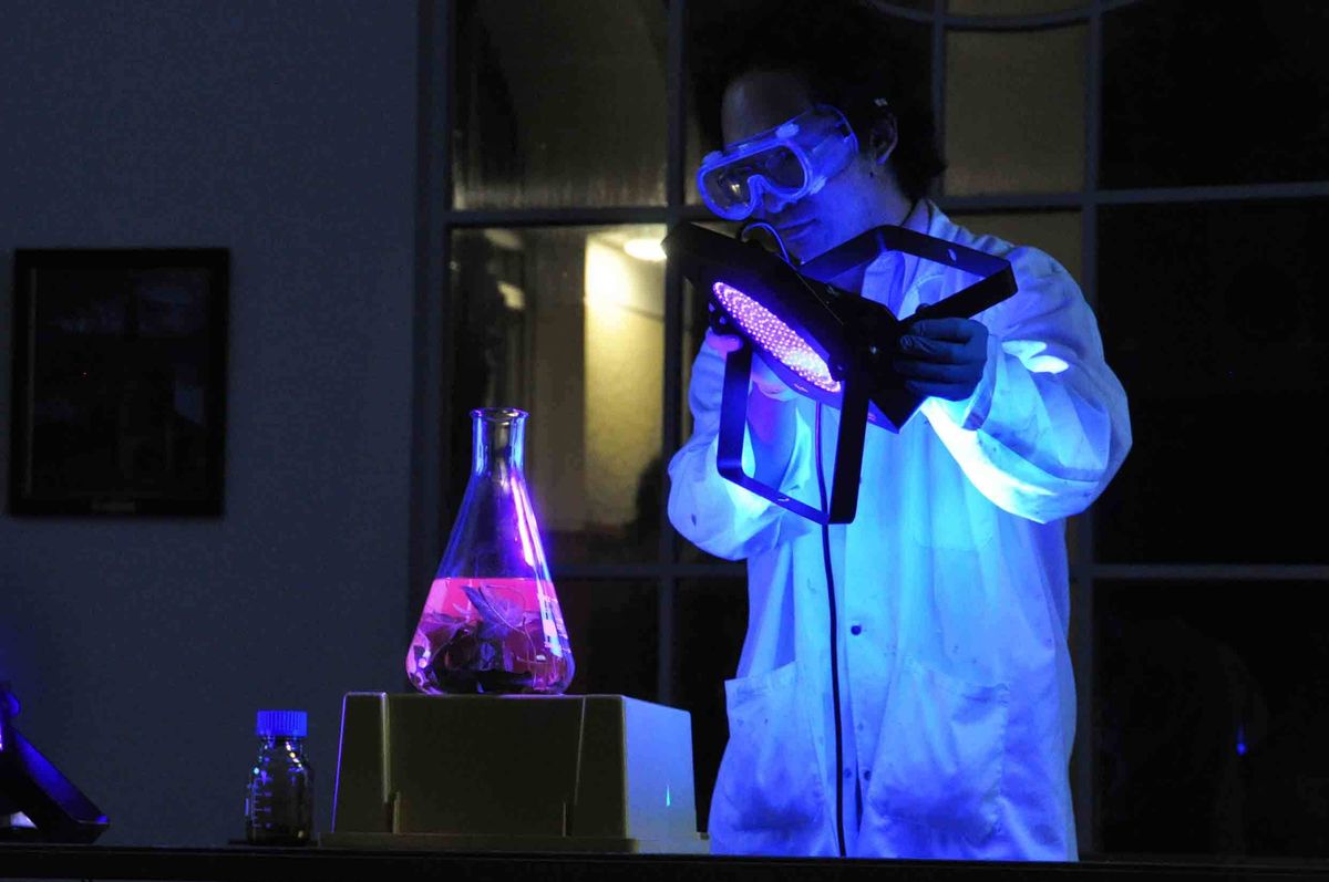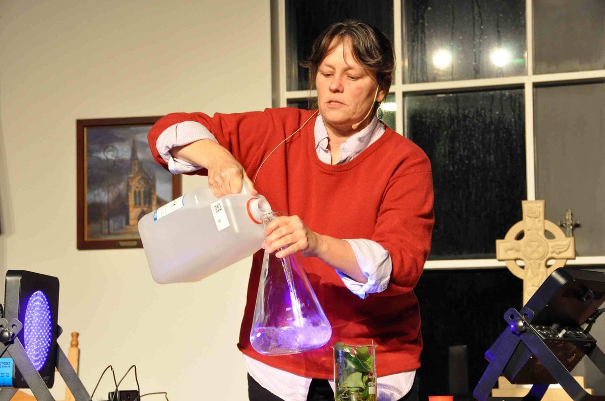 Dr Simpson along with her three PhD students, led demonstrations with each involving light and energy. One in particular used common household items; Berocca tablets and water. They were put through a tube to demonstrate how a particular vitamin in the tablet travels through our body. The bright orange colour is one of the vitamins in the tablet and not a dye. The scientists added dry ice to the bottom of the tube as an added effect.