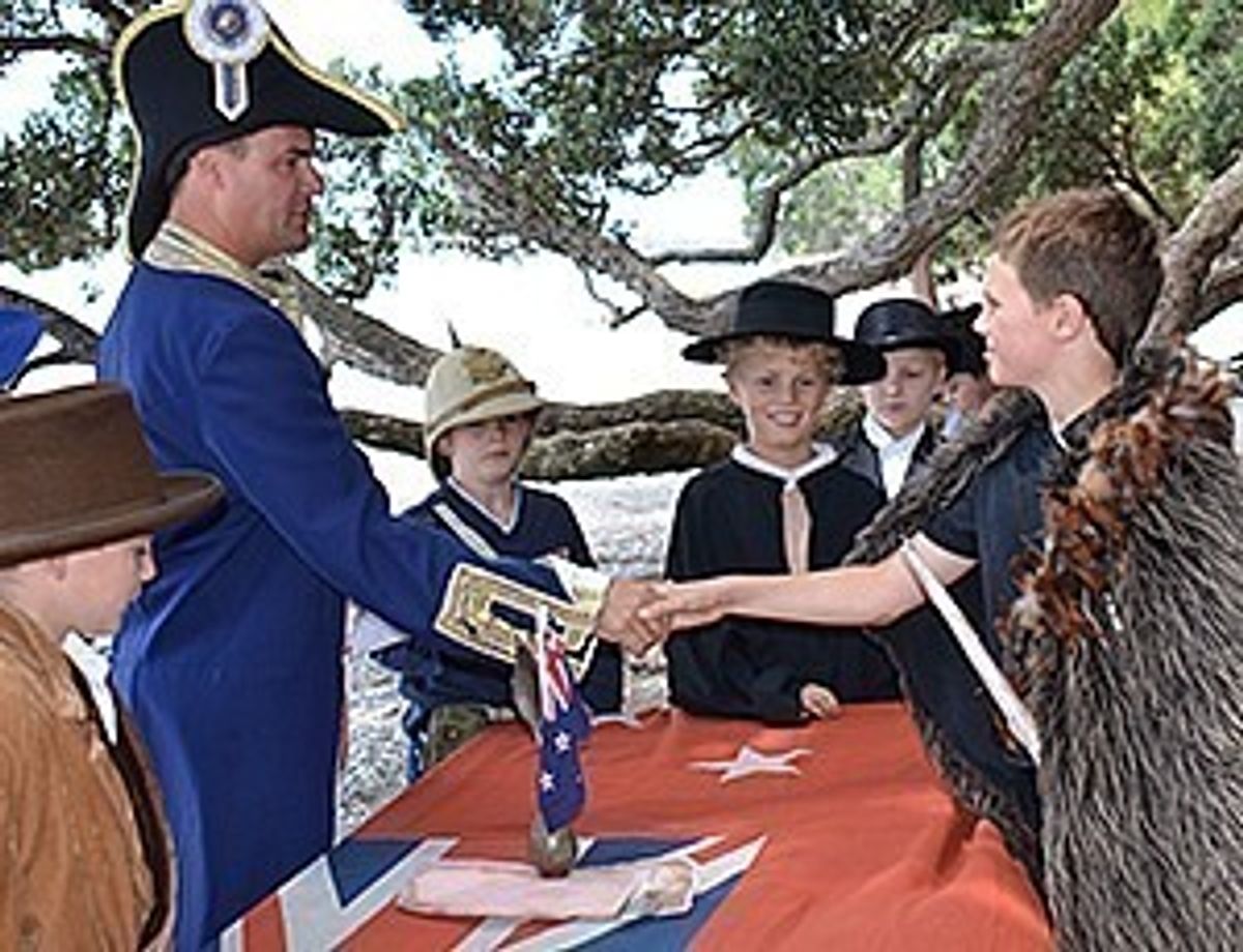 Once the boys had eaten their lunch in the shade of an enormous pohutukawa, a table was laid out with the red ensign, re-creating the scene on the day of the signing in Waitangi. Teacher, Mr Anton Lorenzon took on the role of Captain William Hobson and those who had been assigned roles - the narrators, the missionary, William Colenso, James Busby and the chiefs, Tareha, Tamati Waka Nene and Hone Heke - came forward and delivered their lines with confidence. After each chief signed, they shook hands with Hobson who said, ‘He iwi tahi tatou’ - ‘We are one people’