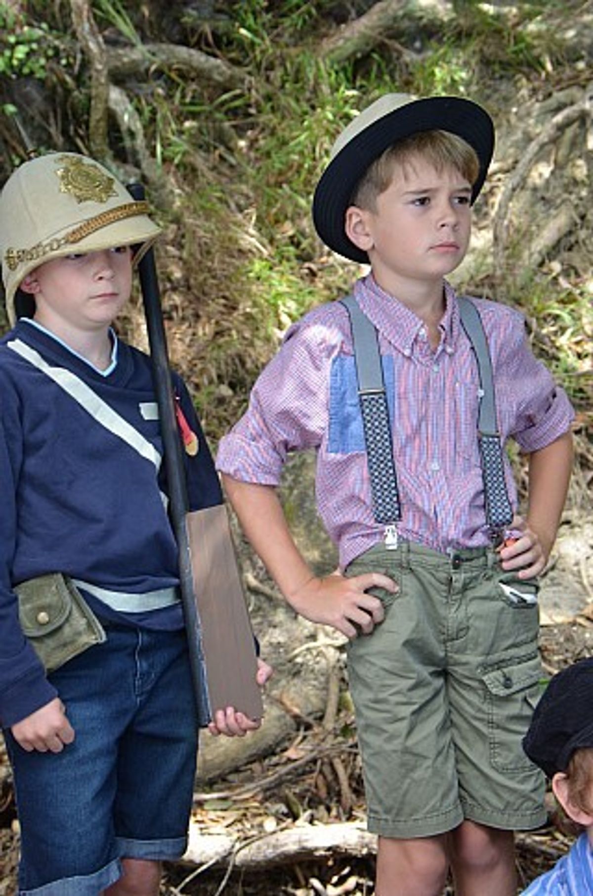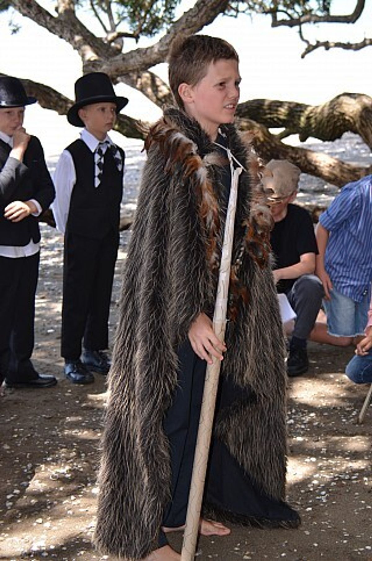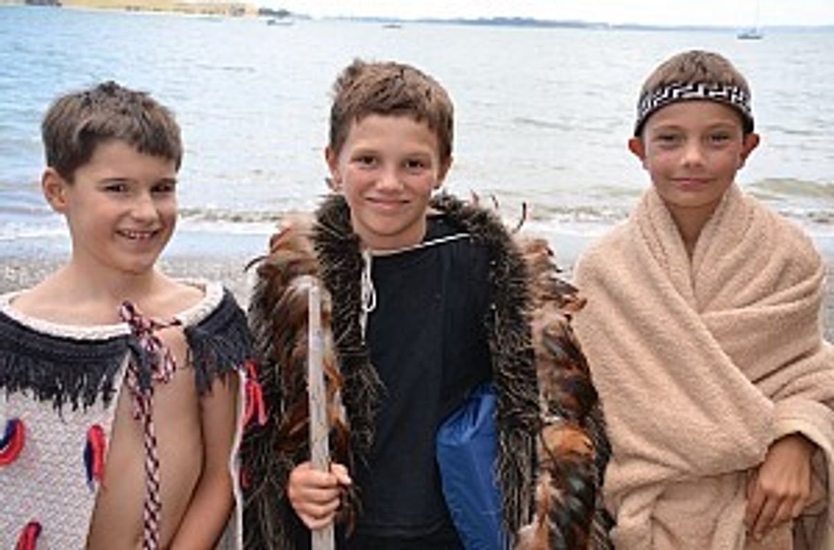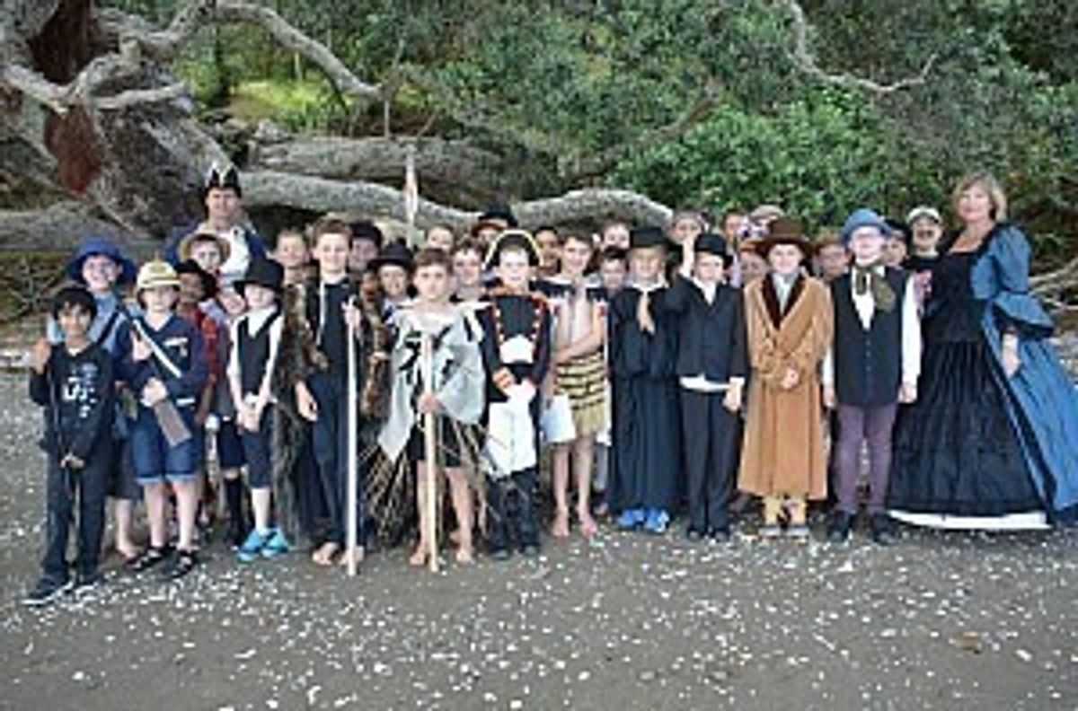 There was much excitement from the boys as they left school dressed in period costume, some taking the role of the British, while others dressed as Maori chiefs. Leading up to the trip, they had written and prepared a short play to perform on the beach. (On the way, Year 5 teacher, Mrs Caroline Williams discovered the hard way that a full crinoline petticoat and a modern suburban bus are not necessarily a good mix!)