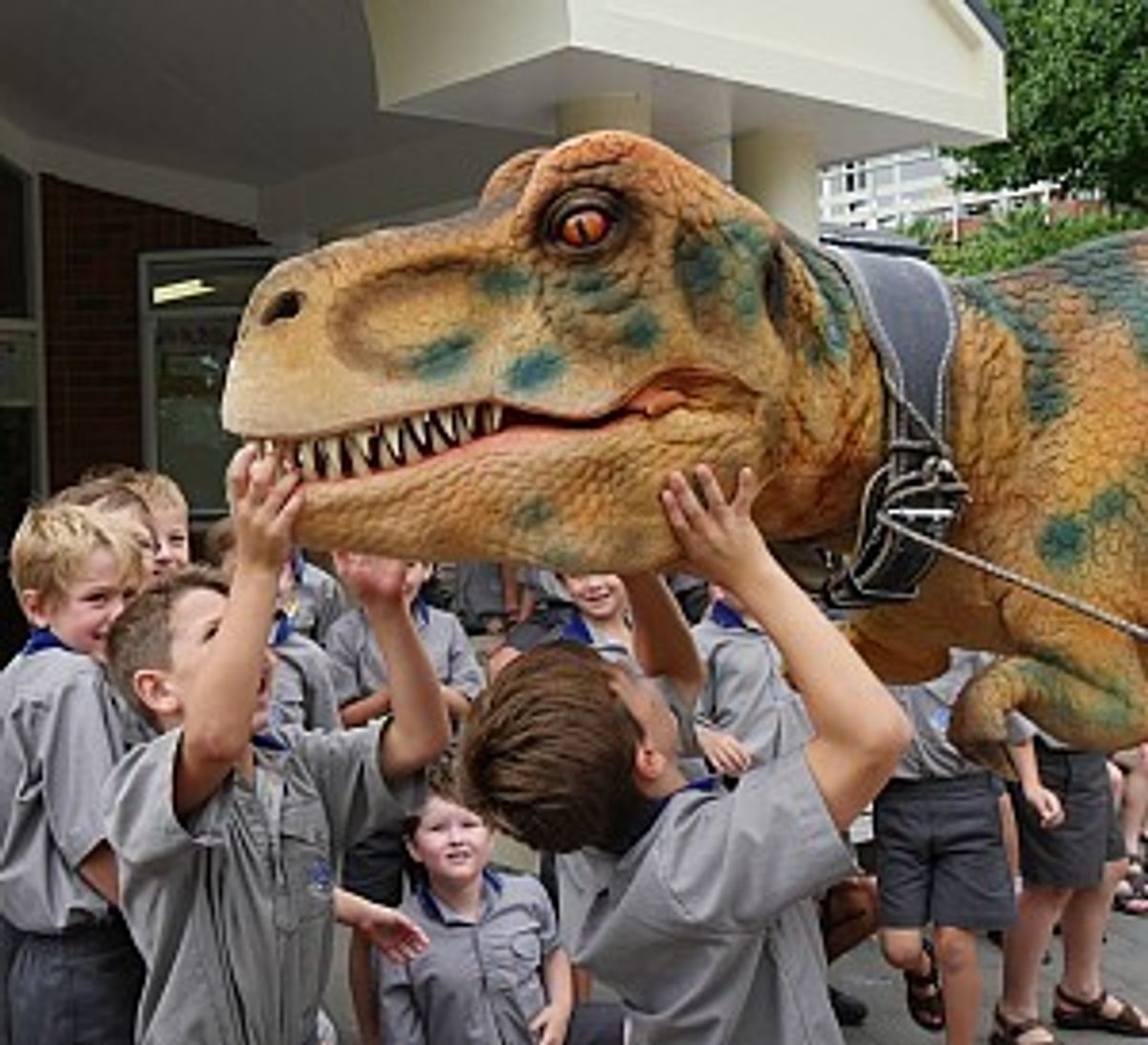 Eyes opened wide and jaws dropped when a most unusual visitor paid a visit to the Boys’ School today! And it wasn’t only the Year 3 boys in awe, the teachers were equally taken aback when a life-like baby Tyrannosaurus Rex, weighing close to 180kgs, lumbered across the Junior School playground with eyes glinting, tail swinging and its huge row of teeth taking snaps at anyone in reach!
