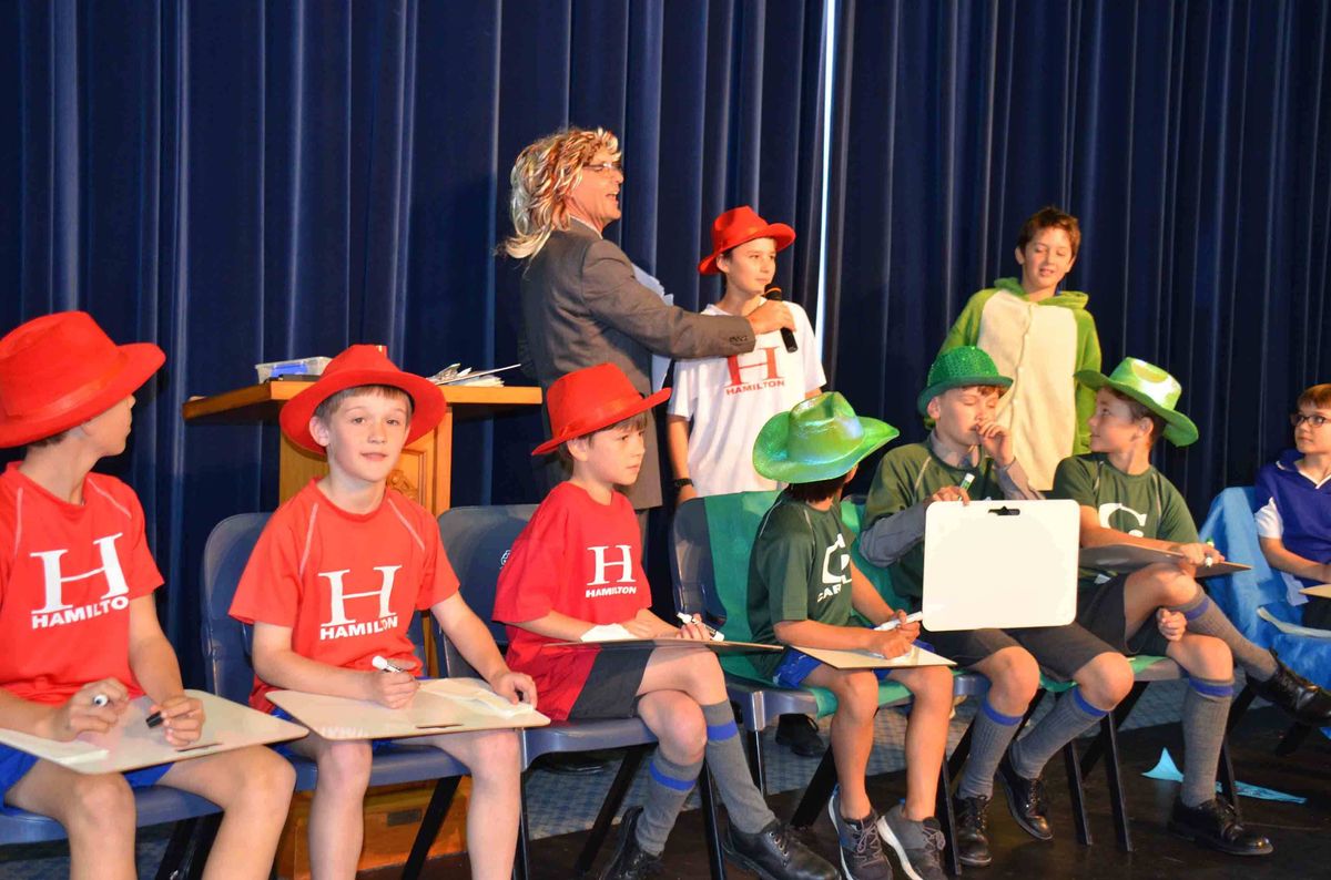 Representatives from the Junior, Middle and Senior Schools had been selected from earlier elimination heats to determine which three boys would represent their House to compete at each level on the final day of the competition. Whilst the House teams stepped up to the stage to compete, additional questions were thrown to the audience – a correct answer giving them the chance to select the next category of questions.