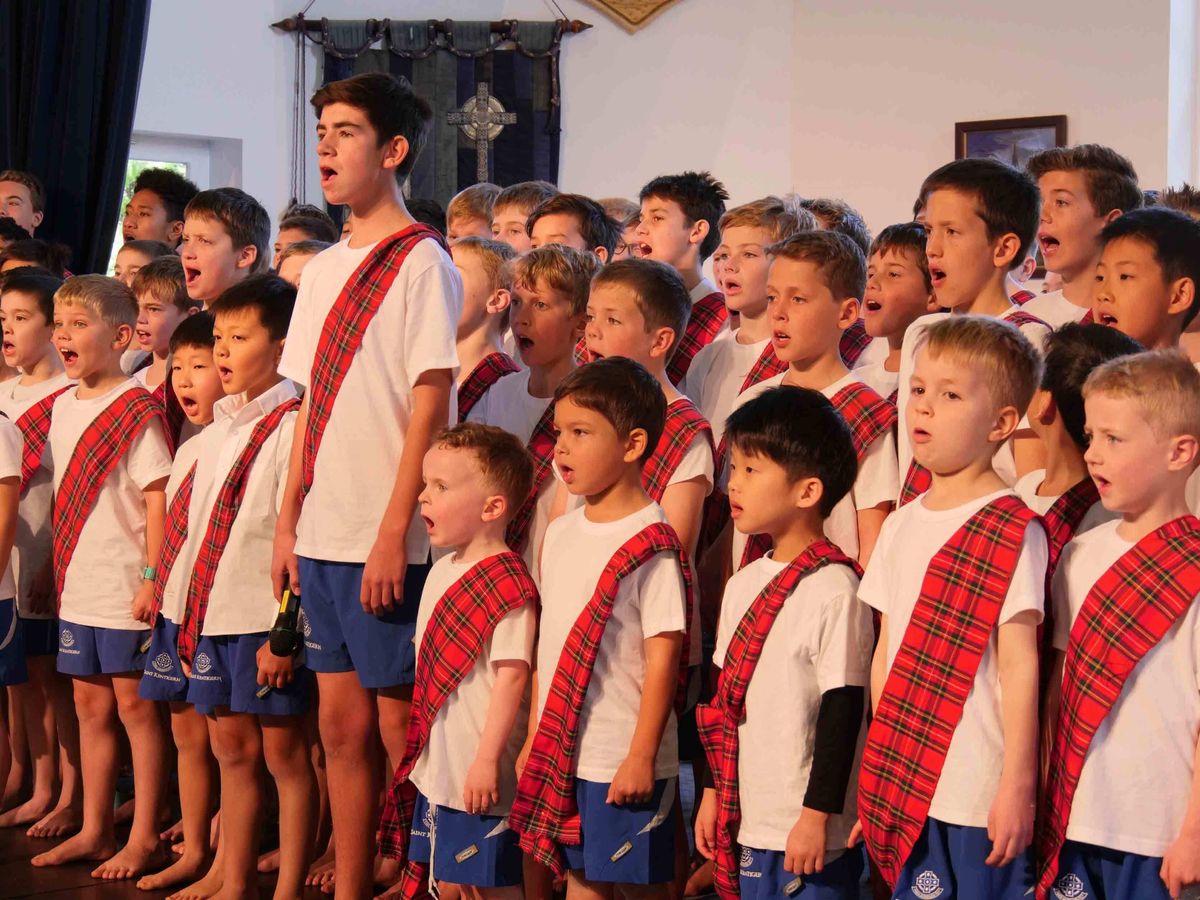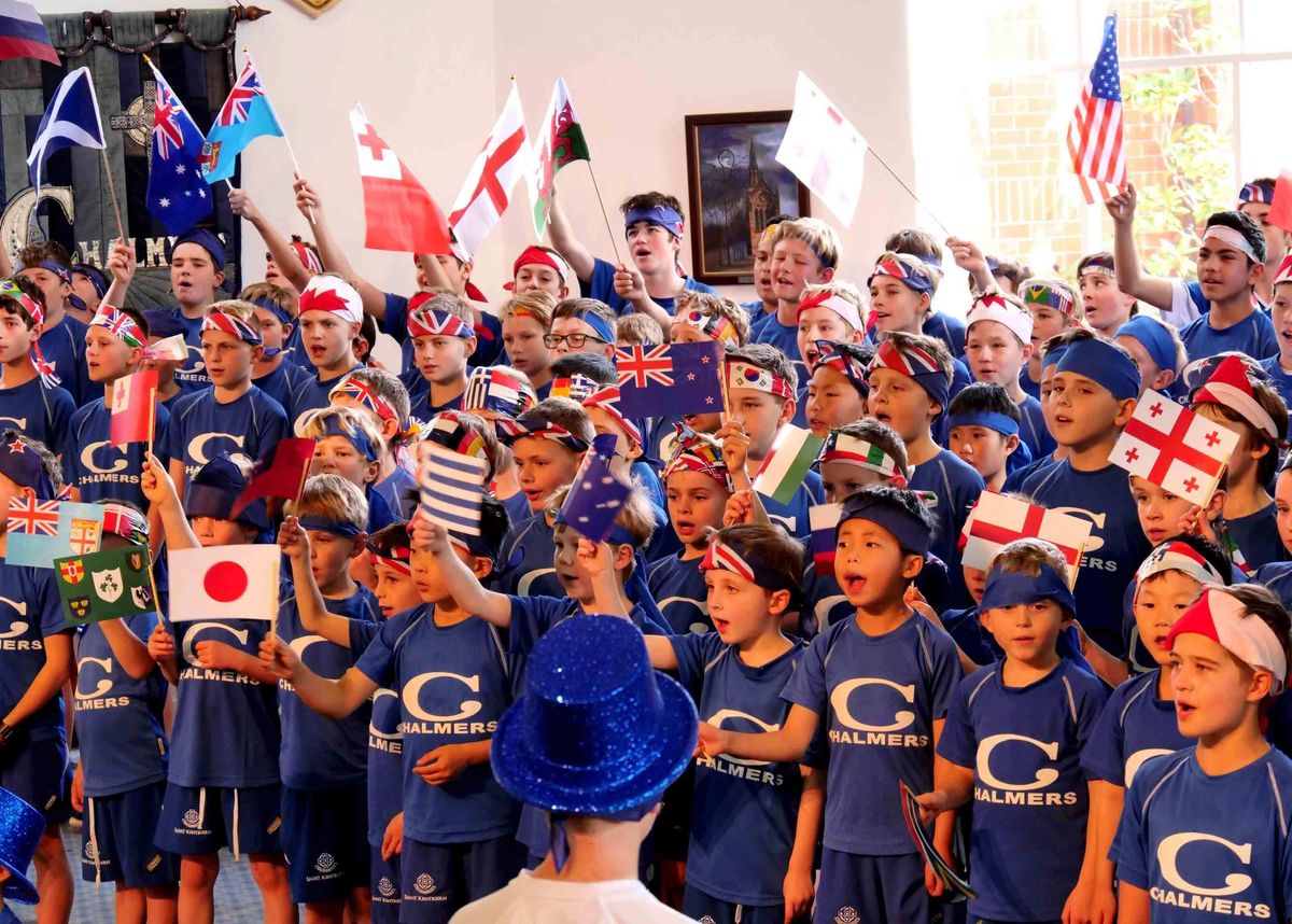 Cargill opened with ‘Ireland’s Call,’ complete with an Irish band and jig, with Charles Adams (Year 8), Frankie Fitness (Year 6) and George McGuinness (Year 6) taking the solo spot. Chalmers’ ‘World in Union,’ introduced in Japanese by Cayden Lin- Vaile (Year 8), was a bright blaze of waving world flags! Louis Kwok (Year 2) sang solo, and Oscar Horton (Year 8) and Freddie Gardner (Year 8) sang in duet for Chalmers. Wishart picked up on England’s theme, singing ‘Jerusalem’ with fervour. Last to perform, Hamilton chose to reflect our Scottish roots, all in tartan sashes with bagpipe support to sing ‘Flower of Scotland.’ Year 8 student, George Wilby took the opening solo.