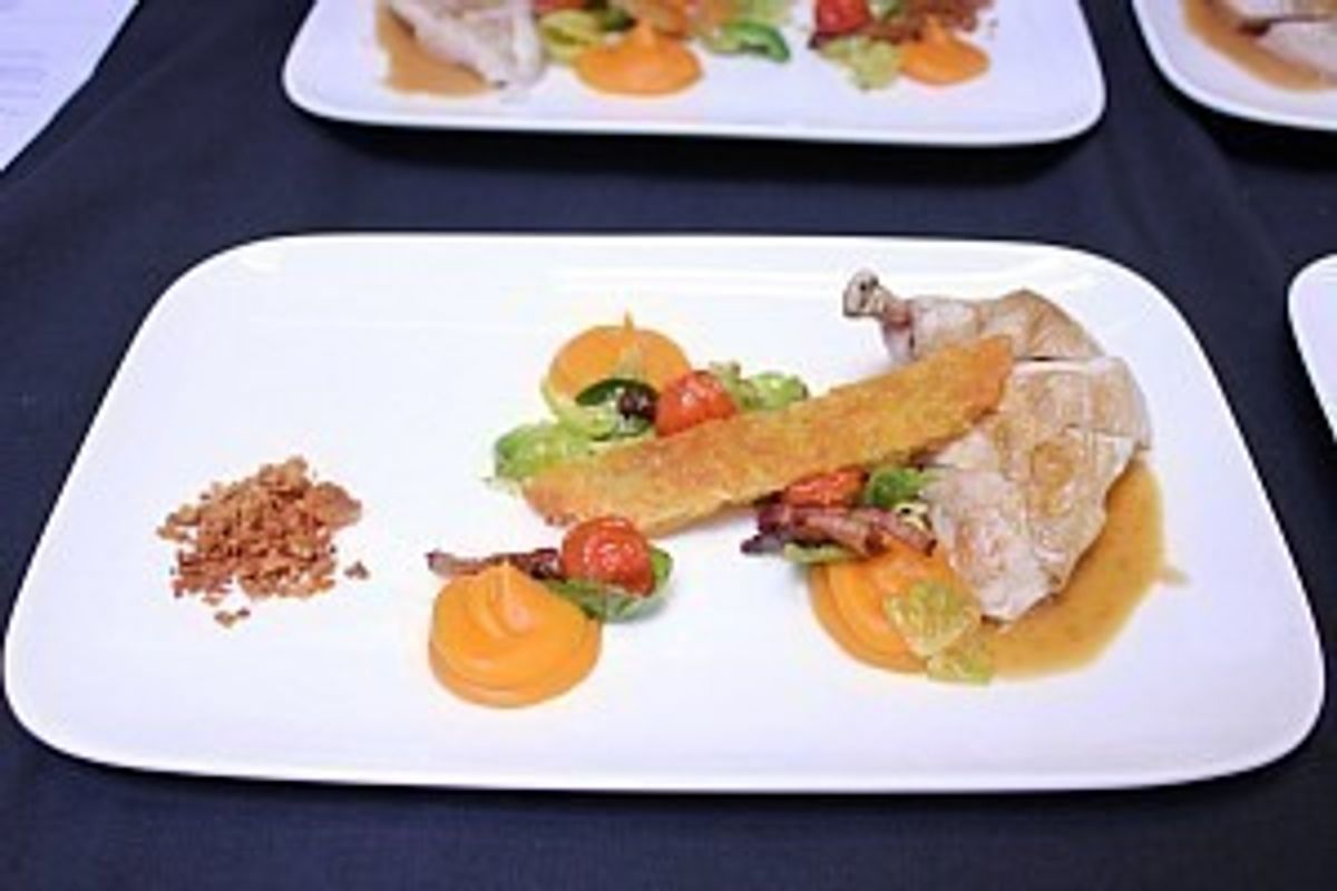 For entrée they served a vibrant beetroot spelt risotto with goat cheese and fennel. This was followed by a sumptuous French-roasted chicken breast accompanied by pancetta lardons, brussels sprouts, kumara puree, potato rosti and roasted cherry tomatoes. The dishes were judged by industry chefs taking the following criteria into consideration: uniformity, technical ability, mise en place, timing, temperature, plating, taste and balance of flavours.