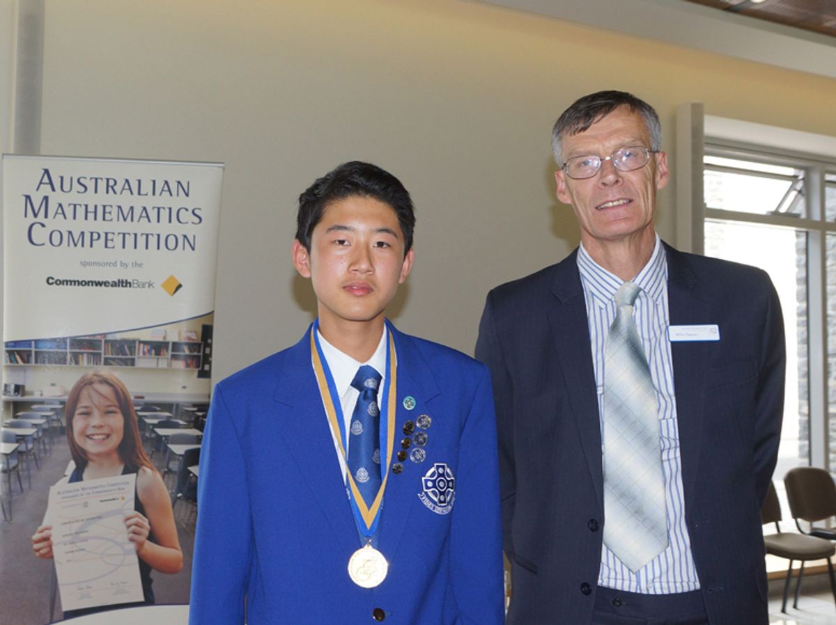College student Andrew Chen has continued his outstanding form in the Australian Mathematics Competition. The renowned competition is undertaken by around 600,000 students each year in more than 30 countries around the world. The paper consists of 30 questions, ordered in increasing difficulty, which must be answered in 75 minutes. Each year a select number of students are awarded medals for their performance. The number of medals allocated is equivalent to a standard achieved by 1 in 10,000 entrants, the top 0.1 per cent. Andrew was one of 14 competitors to receive a medal in the intermediate section (Year 10-11). He was the only New Zealander to medal in the intermediate category. In the past four years he has also received a prize for placing in the top 0.3 per cent. He also received the Prudence Award for having the highest number of consecutive correct answers among entrants from the College. Andrew travelled to Christchurch on Friday to be presented his medal by Professor Mike Clapper, executive director of the Australia Mathematics Trust. Well done, Andrew!