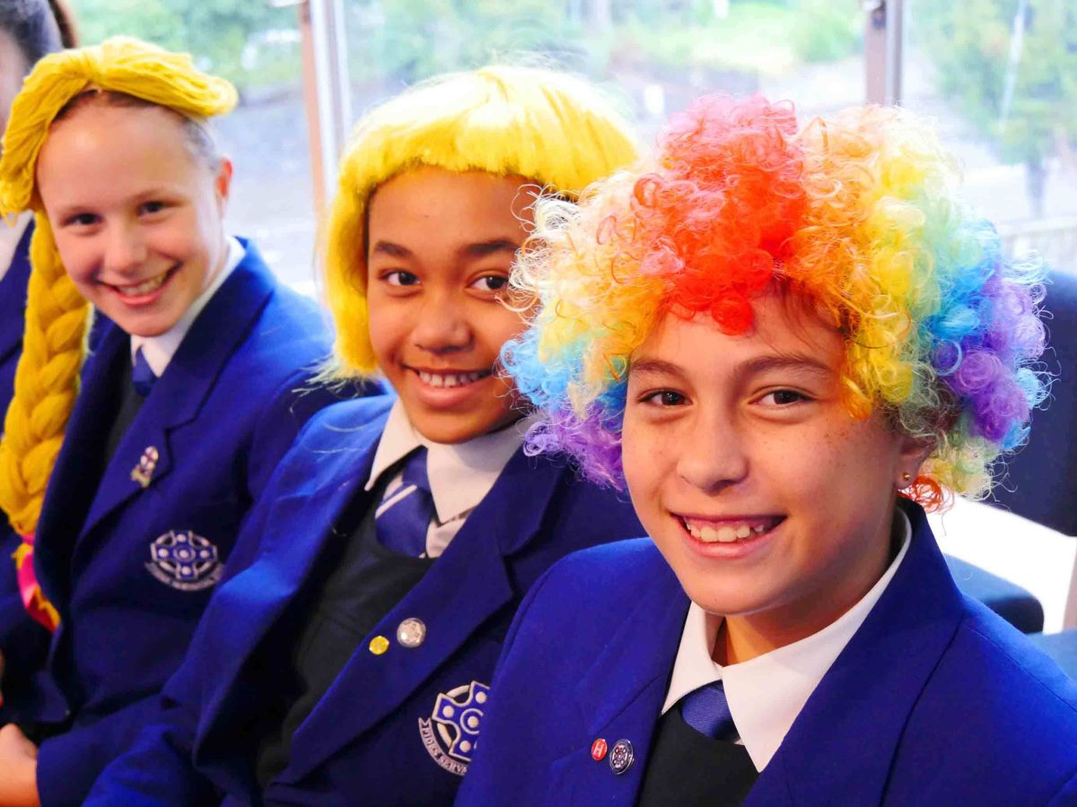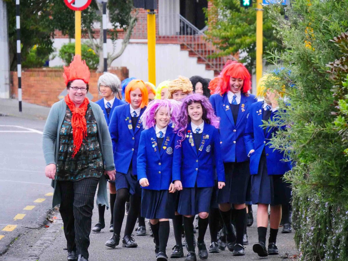 On a grey, drizzly day, the Girls’ School cut a bright swathe of colour as they walked along Remuera Road to Chapel at Somervell Church this morning. Neat and tidy in their formal uniforms, they were a sea of blue from shoulders down, but their usual navy blue winter berets had been set aside for a parade of wild and funky hair dos blowing in the wind!