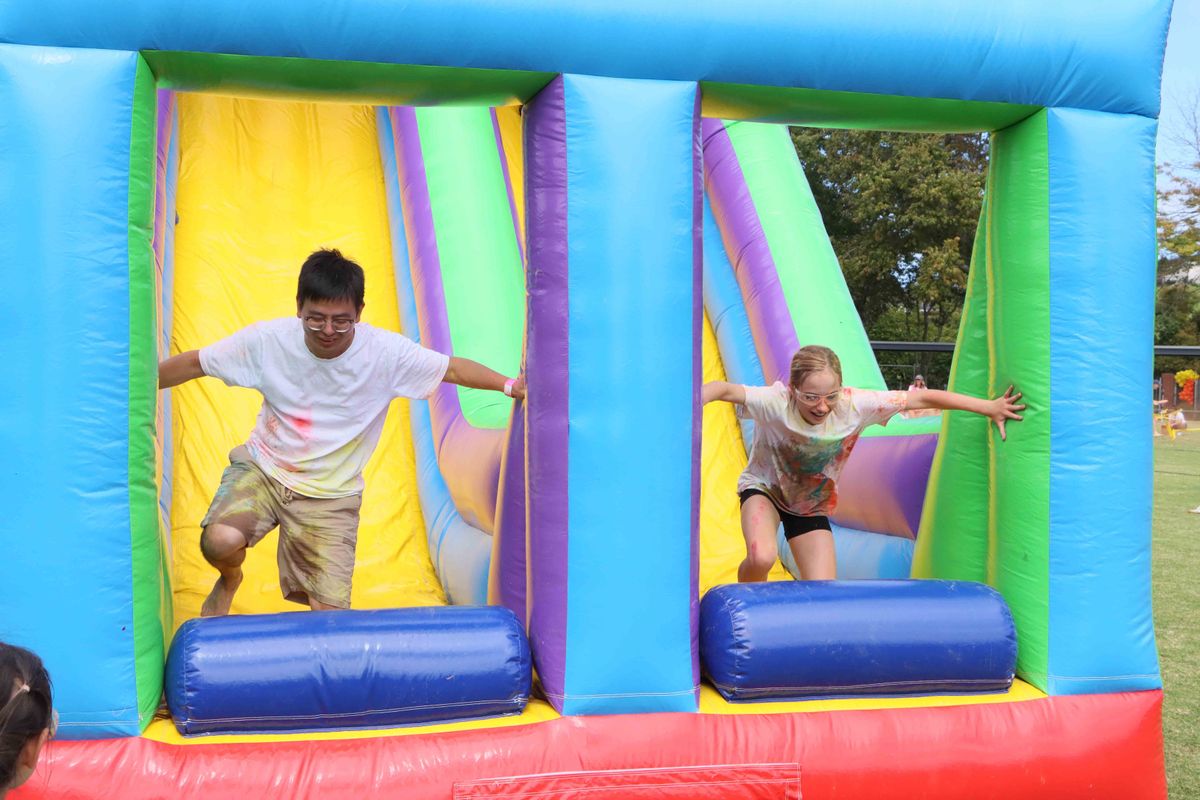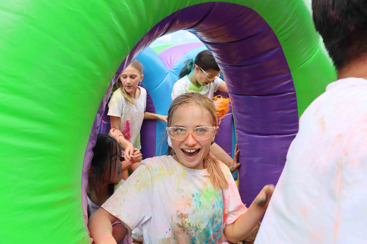 At the heart of the afternoon, of course, was the run itself, reimagined this year to offer greater spectacle. Participants were met first by a foam pit, ensuring that every runner began the course coated and ready to collect the bursts of colour that followed. From there, the route demanded both agility and determination. Girls, siblings, and parents scrambled beneath netting in a military-style crawl, balanced along beams, and navigated a large inflatable obstacle course before emerging in a cloud of colour.