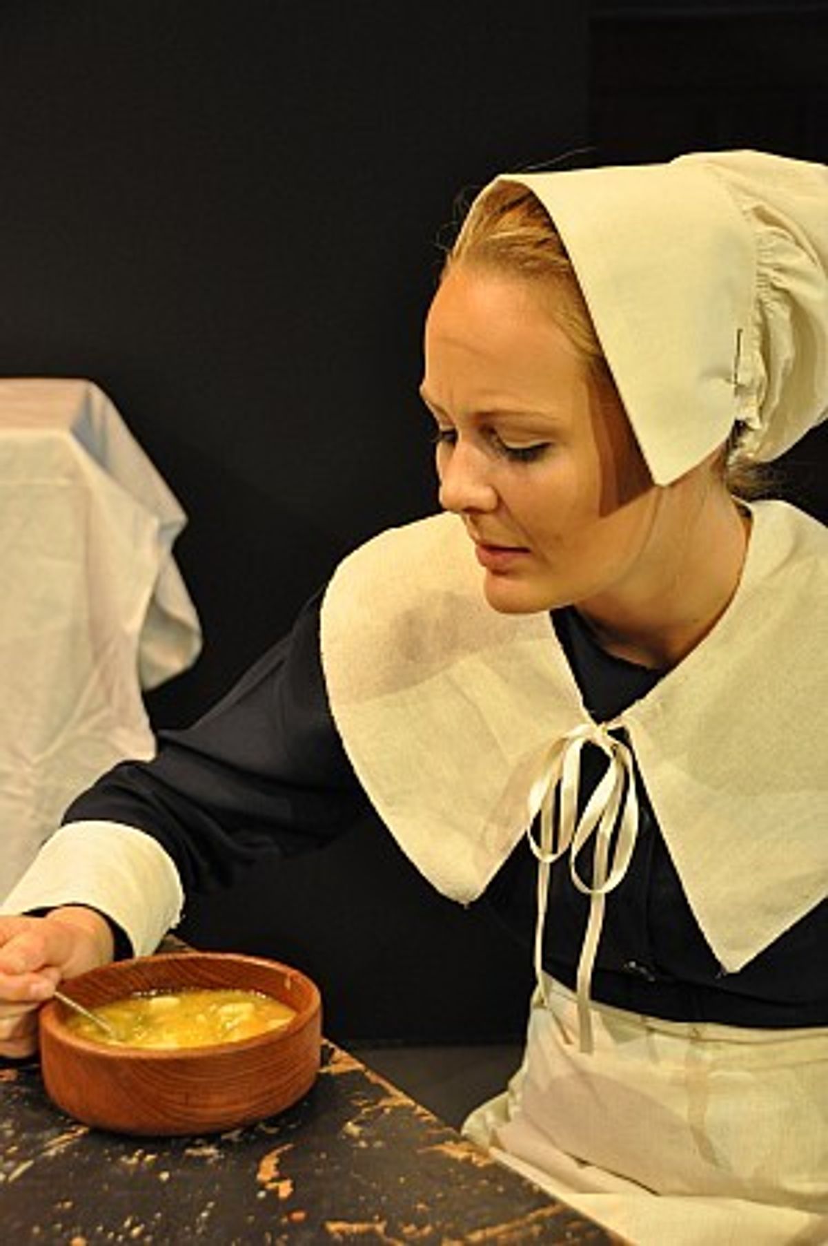 Suspected of witchcraft, word spreads fast in this insular community and Parris's worried flock congregate outside his home demanding answers. A widower, he has little understanding of children and is already at odds with his congregation for his seemingly mercenary approach. He is confused by the situation and calls on Reverend John Hale (Peter Carberry), an occult specialist, to assess the situation. Sitting quietly in the corner observing is Parris’s niece, Abigail (Alice Finnegan), the spiteful ringleader of the girls who is drawn to confess to dancing in the woods. Rather than take her punishment, the manipulative girl spots an opportunity to wreak vengeance on the Proctor family for dismissing her from their employ after an affair with the master, John Proctor (Lloyd David). She deflects judgment of her own behavior with frenzied accusations of witchcraft among her neighbours and as Betty awakes she, too, follows suit screaming, 'I saw Elizabeth Proctor with the Devil!' which sets in motion the witch hunt that brought a New England Puritan community to its knees in 1692. Many innocent men and women were hanged and many more were wrongly accused of consorting with the devil.