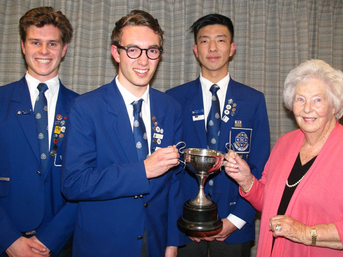 Held annually since 1983, the prized cup is challenged for each year by the debating teams of Saint Kentigern, Pakuranga and Edgewater Colleges. A founding member and president of Rotary at the time, Noel Holyoake bequeathed the cup and as is customary, each member of the winning team is awarded a monetary prize by the sponsors for their achievement. This year, Mrs Betty Holyoake presented the prizes to the boys.