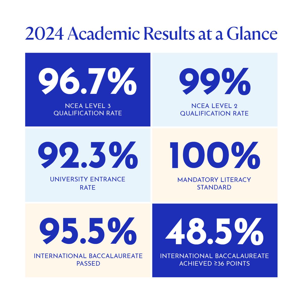 In 2024, our students have once again demonstrated exceptional academic performance, with outstanding results in both NCEA and the International Baccalaureate (IB) programmes, far surpassing national and high-decile school benchmarks. These impressive results reflect the dedication of our students, the expertise of our teachers, and the strong support of our school community, all of which combine to create an environment where excellence thrives.