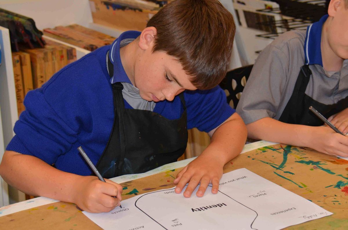 The boys learnt how symbols can be representations and how we can use these to tell people about ourselves. Using a template, they were first challenged to express in words what defined them individually, such as their favourite clothing, colour, food, pets, activities or place. From this they built a personal art work, firstly using shapes to block coloured dye sprayed from bottles, before filling in the areas left white with things that are important to them, using lines and colours to compare and contrast the representation of feelings and the meanings associated to these.