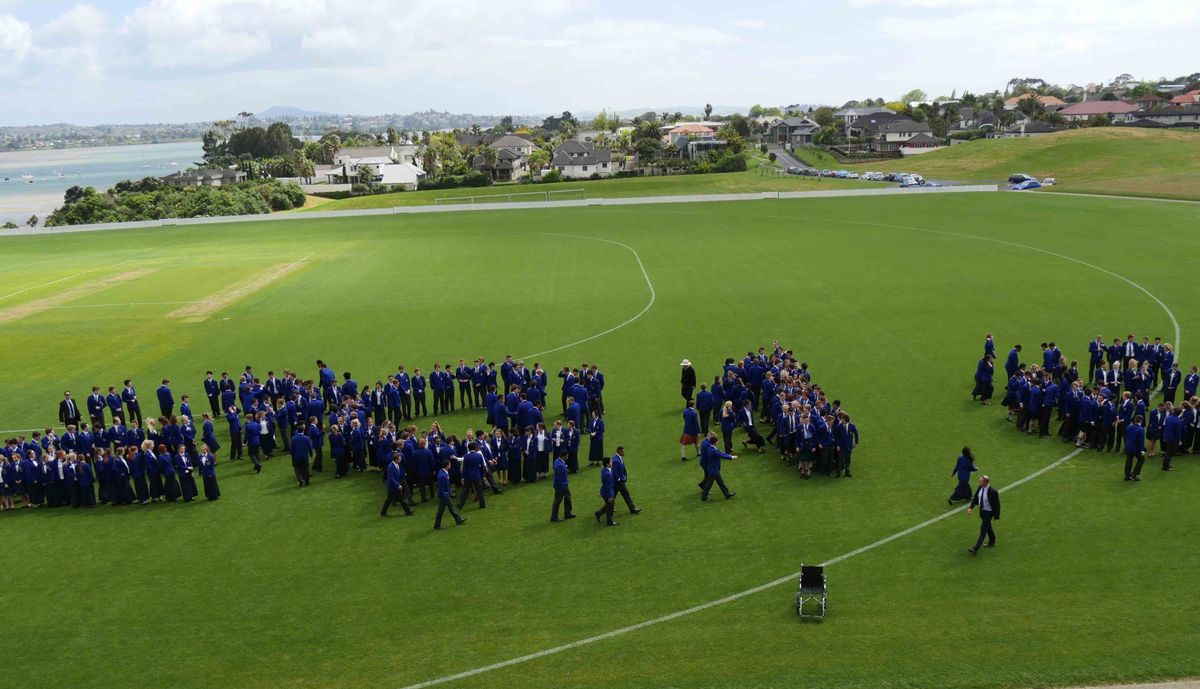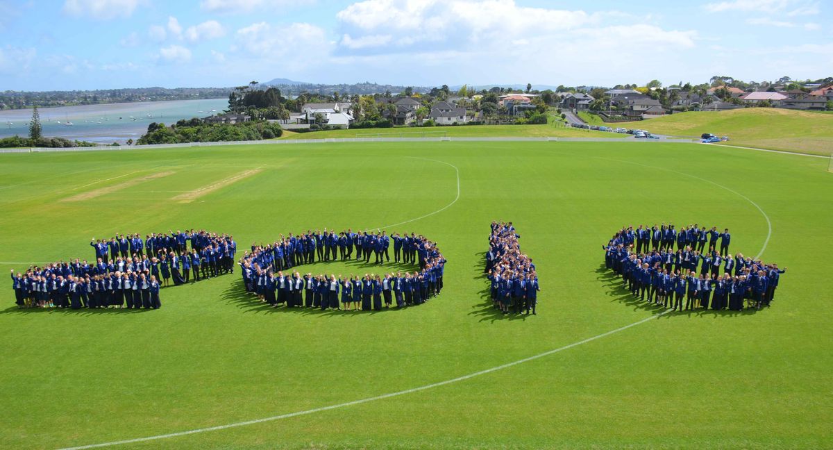 Year 13 pipers, William Eaddy and Matthew Clow, with support from Year 11 drummer, Fraser McEwan, then piped the graduates to the Sports Centre for what has become an annual tradition. From initial chaos, 2016 quickly unfolded on the field as each House group of students organised themselves into one of the giant numbers for an aerial photo.