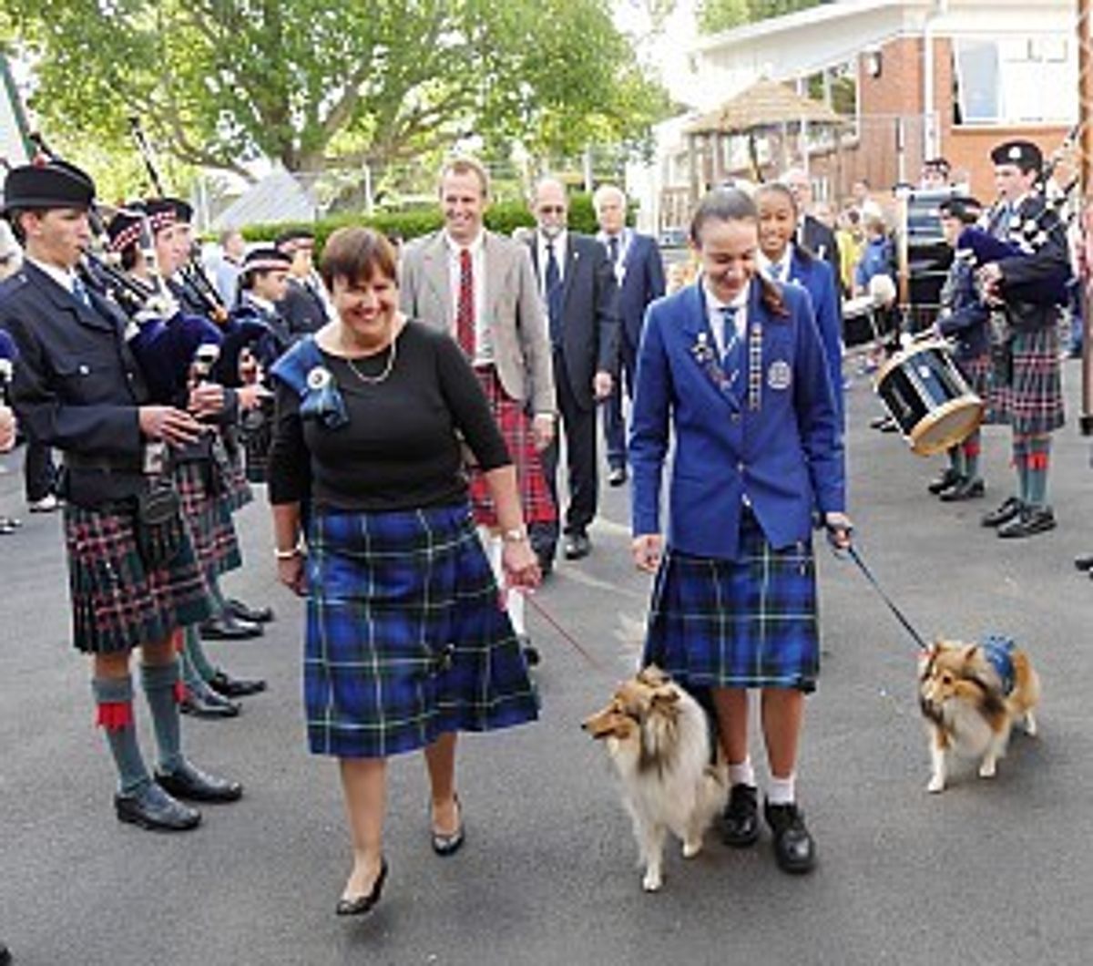 Heading the march was Principal, Dr Sandra Hastie along with Head Girl, Moiralisa Ainu'u Aneru and Deputy Head Girl, Zara Smith. Two new ‘girls’ had also joined the ranks! Dr Hastie’s four legged friends, Meg and Skye were on parade, also dressed in Saint Kentigern kilts! Director of the Preschool, Mrs Sue Nash had quietly organised her mother to outfit the Shelties ready for the day. For those who remember Dr Hastie’s ‘Callum of Tux Wonder Dog infamy’ (he was caught on camera licking out the dishwasher!), rest assured, Meg and Skye were model canine citizens on the day!