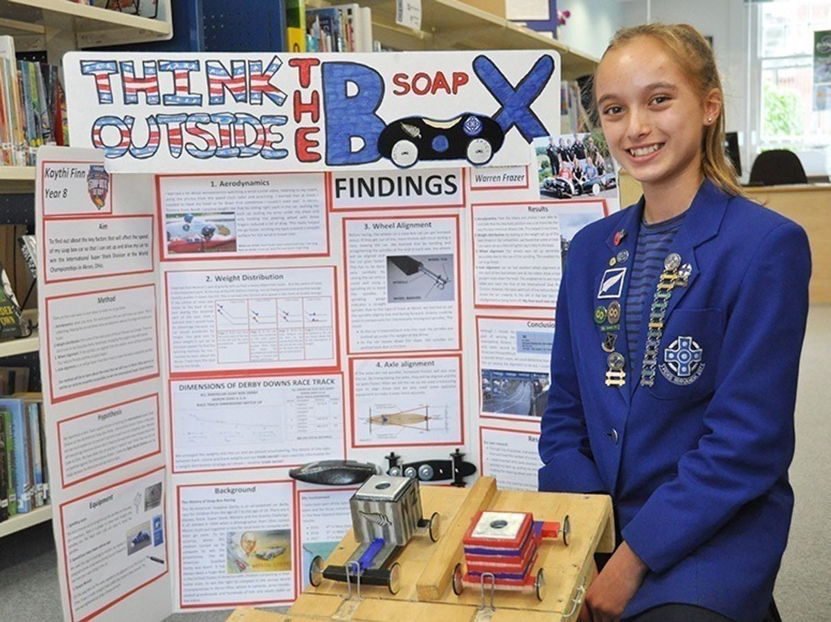 Kaythi Finn received a silver sponsor’s award from Auckland Transport – ‘A day in the life of Auckland Transport,’ she was also highly commended for her project ‘Think outside the Soapbox’. Kaythi aimed to find out about the key factors that will affect the speed of her soapbox car. She looked at four ways to help her car go faster for a better chance at winning, which included aerodynamics, weight distribution, wheel alignment and axle alignment.