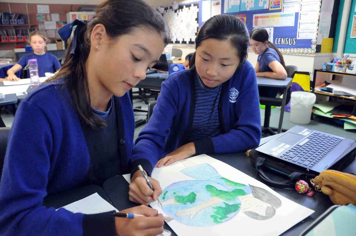 This term, the Girls’ School Year 7 and 8 students have been learning how they can use maps and have been designing their own that not only show different countries but also represent a deeper meaning. Using a combination of Geography, Social Science, Mathematics and Art, the girls individually or in pairs have created maps that shine light on their representation of the world and raise awareness around current world or environmental issues. The girls have been passionate about their ideas and have touched base on issues around war and global warming.
