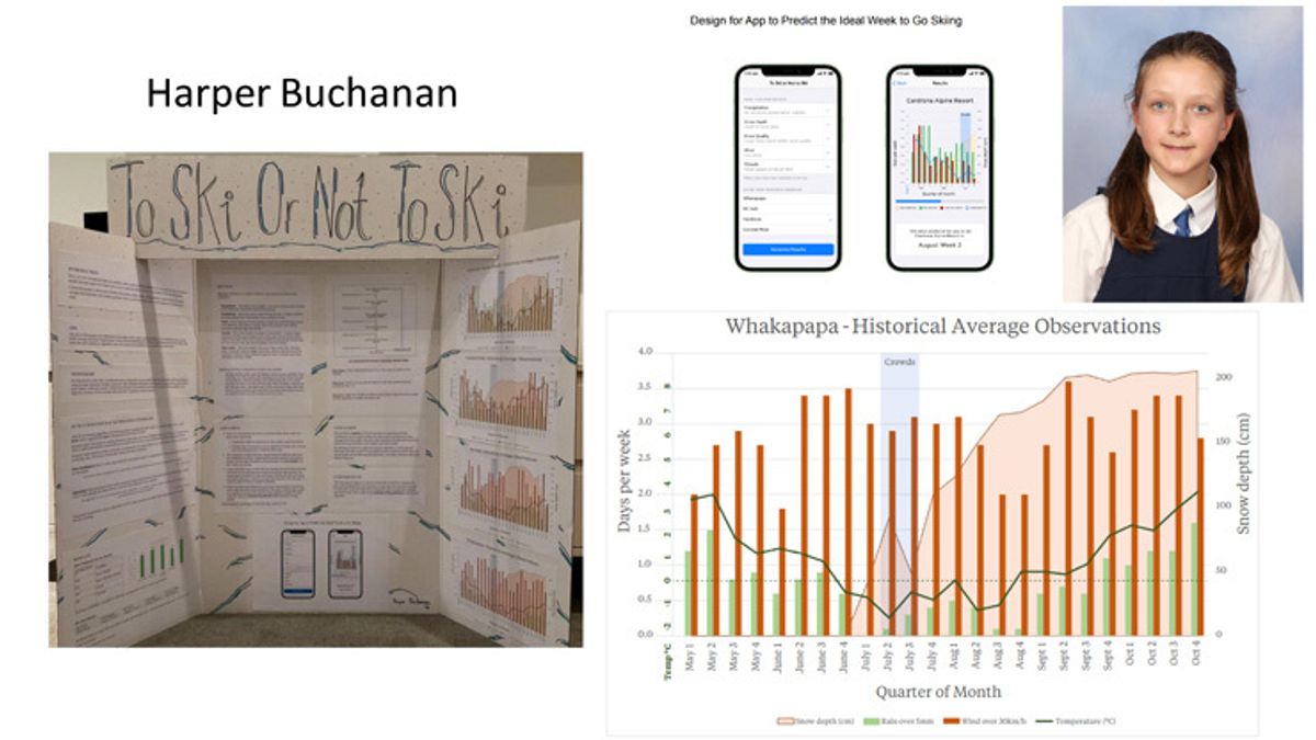 Placed First in the Human Behaviour category, Ava Van Rij’s project ‘Noise’ pondered the question of whether additional noise could impede concentration and the ability for students to focus or perform in routine maths tasks or questions. Her project was also awarded two Special Prizes. Awarded First place in the Research category, Harper Buchanan’s project, ‘To ski or not to ski’ researched various data sets regarding good snow days to find the optimum day for skiing. Following her study, she proposed a design for an app for the perfect snow day. Harper was also rewarded with a Special Prize.