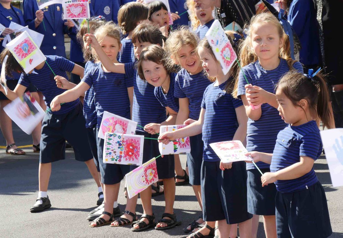 Former Girls’ School and now College student, Fayth Doherty, returned to pipe a surprised Mrs Dobson down the driveway lined with girls and preschoolers regally waving flags! Yes, that was Mrs Dobson’s face on every single flag!