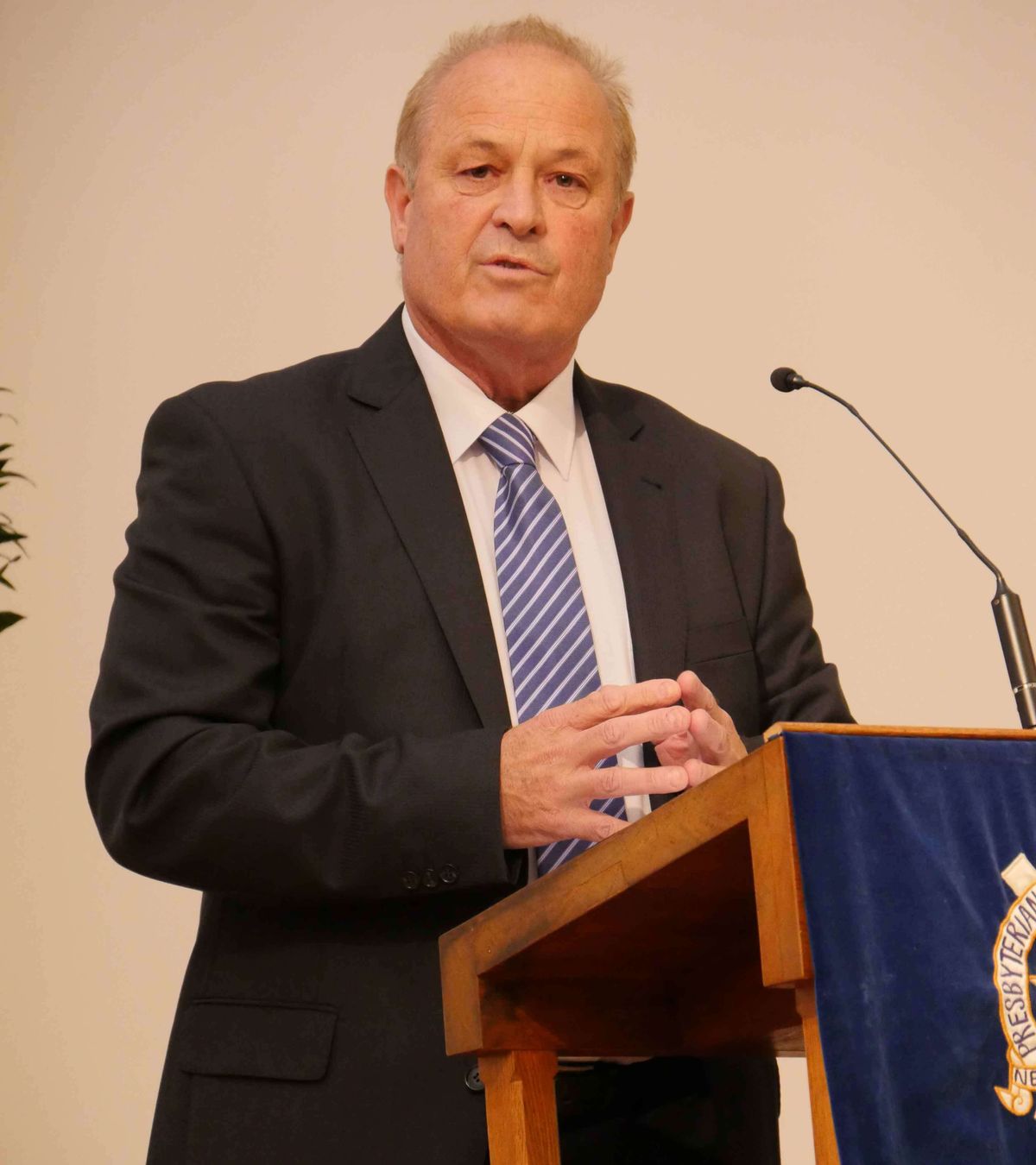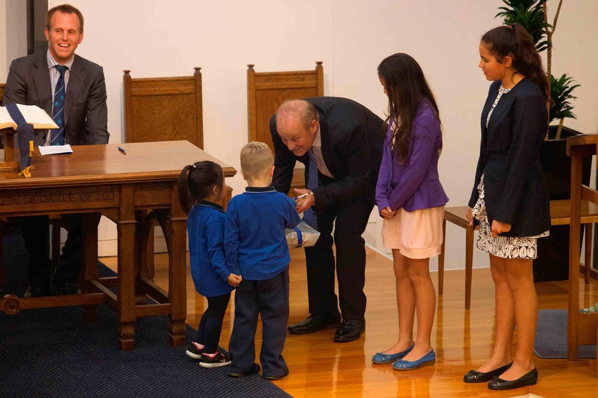 Representatives from each of the age groups, the College, Schools and Preschool, then came forward to present gifts to Mr Hodge. College Head Boy, Matthew Stirling, Girls’ School Head Girl, Lola Wiltshire and preschoolers, Monica Qian and Oscar Hunter were given the honour. As Mr Hodge gratefully accepted the gifts, bending down to greet the preschoolers, he was left with no doubts about where his allegiance now lies – he was presented with a Saint Kentigern Bible, a Saint Kentigern presentation tie and a Saint Kentigern supporter’s jacket – all in blue and white!