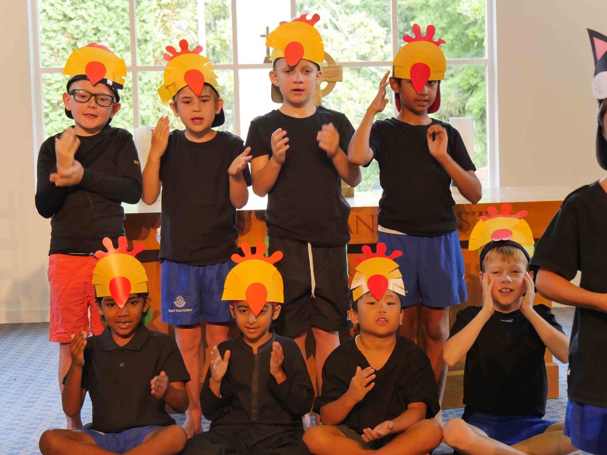 Those who attended this year’s Junior School concert could not help but be impressed by the Year 2 boys’ recital of ‘La Poule Maboule,’ a long story retold with passion and humour entirely in French, complete with actions. The children concentrate on this one story throughout the learning unit. Adapted from the English version, ‘Chicken Little,’ the familiarity, predictability and high level of repetition in the story (‘histoire’) helps the children to build vocabulary in context quickly. Songs, dances and plays are used to engage the boys (‘en action’ – in action). Even at this young age, the boys also memorise grammar raps to learn and use the grammar rules effectively.