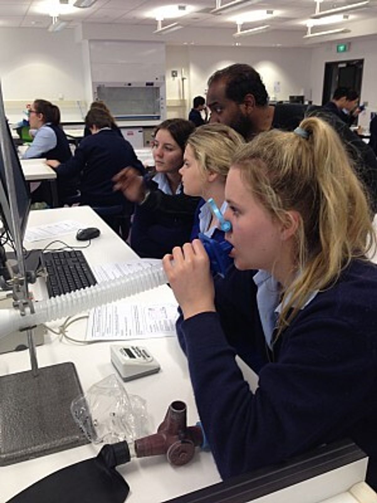 Next, we were taken into one of the University’s impressive physiology labs to explore the process of respiration. Dr Raj Selvaratnam began by explaining the differences in respiratory mechanisms in animals, including how crocodiles use their liver to control the changes in pressure to aid their breathing. He also explained how snakes are able to store oxygen far more effectively than humans and use the fluidity of their body shape to respire when engulfing large prey. After discussing human respiration, we were finally able to use the equipment we had all be desperate to get our hands on! Using a spirometer, we were able to measure our lung capacity and residual volume when exhaling. This hands-on learning will bring extra interest to the human physiology topic we will be looking at later in the course.