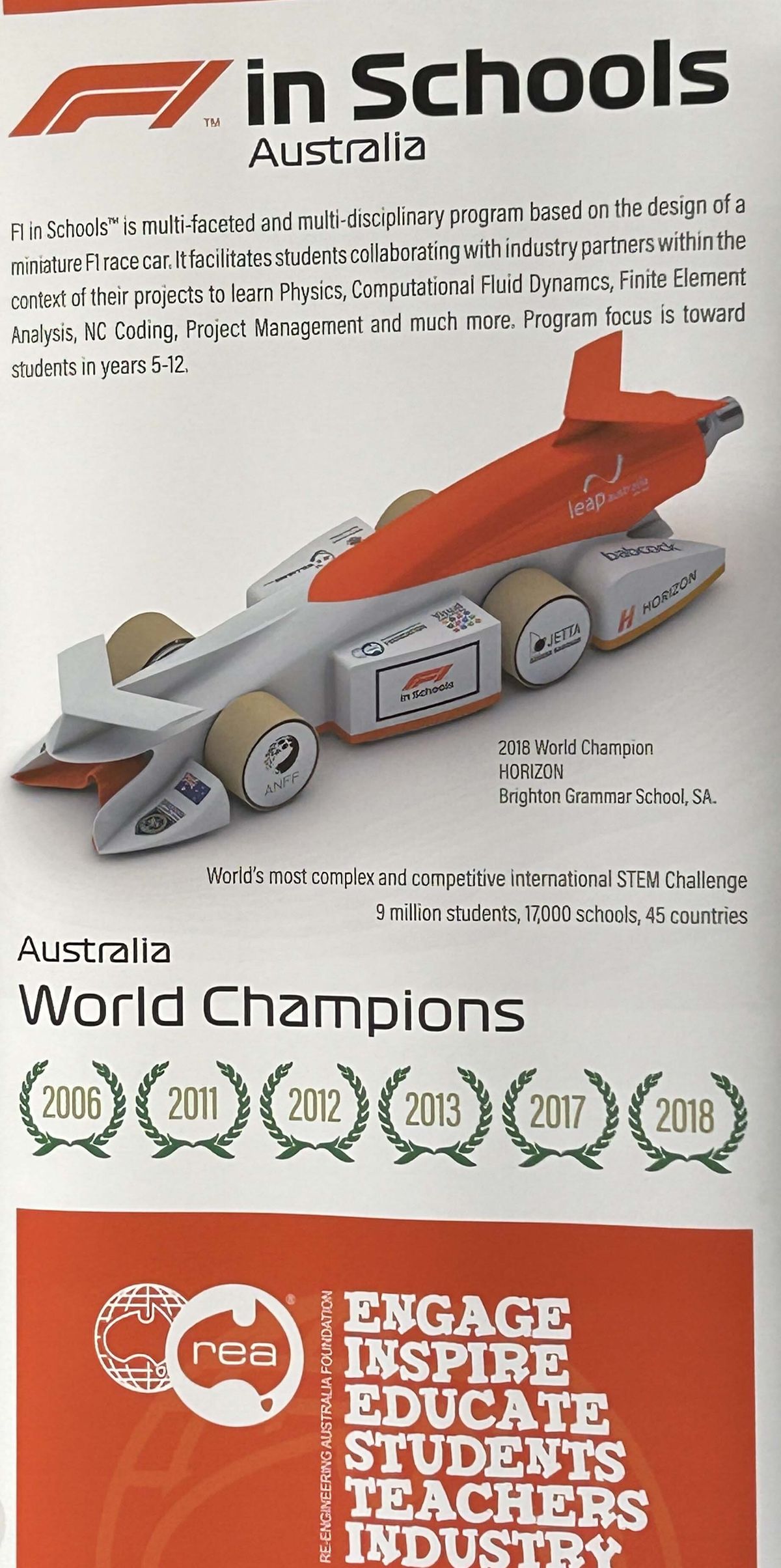 An internationally recognised competition, F1 in Schools combines elements of Science, Technology, Engineering, Art and Mathematics to challenge students to design and develop a ‘mini’ Formula One team. The students create a car, a marketing and finance strategy and an immersive trade display to present at the National Finals each year.