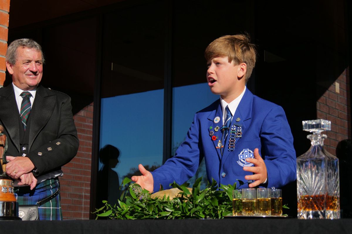 As is tradition, Head Boy Toby Wigglesworth then came forward, joining a long line of Head Boys who have taken on the task of learning and reciting Robbie Burn’s Ode to the Haggis in Gaelic, one he had the privilege of witnessing over the last eight years and been practising every night over the month. All who attended would agree that he delivered the difficult soliloquy with ease and confidence.