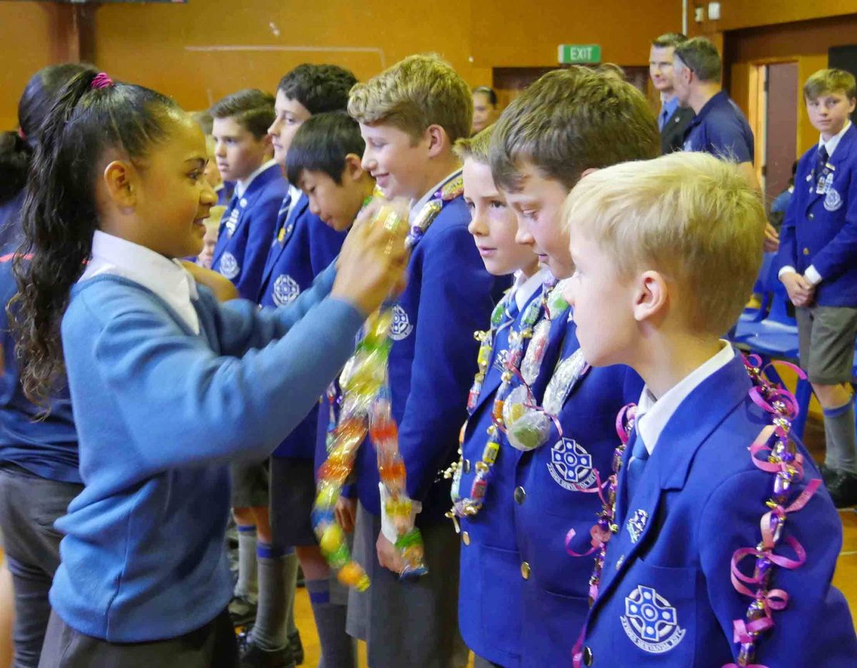 To show their appreciation, the students from Wymondley Road presented our boys with candy leis. Mrs Petelo explained that giving a lei represents an endless line of love, of aroha, to the person you are giving it to. Boys’ School student, Will Philips, who helped at their recent ‘Runathon’ became the centre of attention! The assembly concluded with their boys challenging ours with a haka. It was hard to believe that their students were only Year 6!