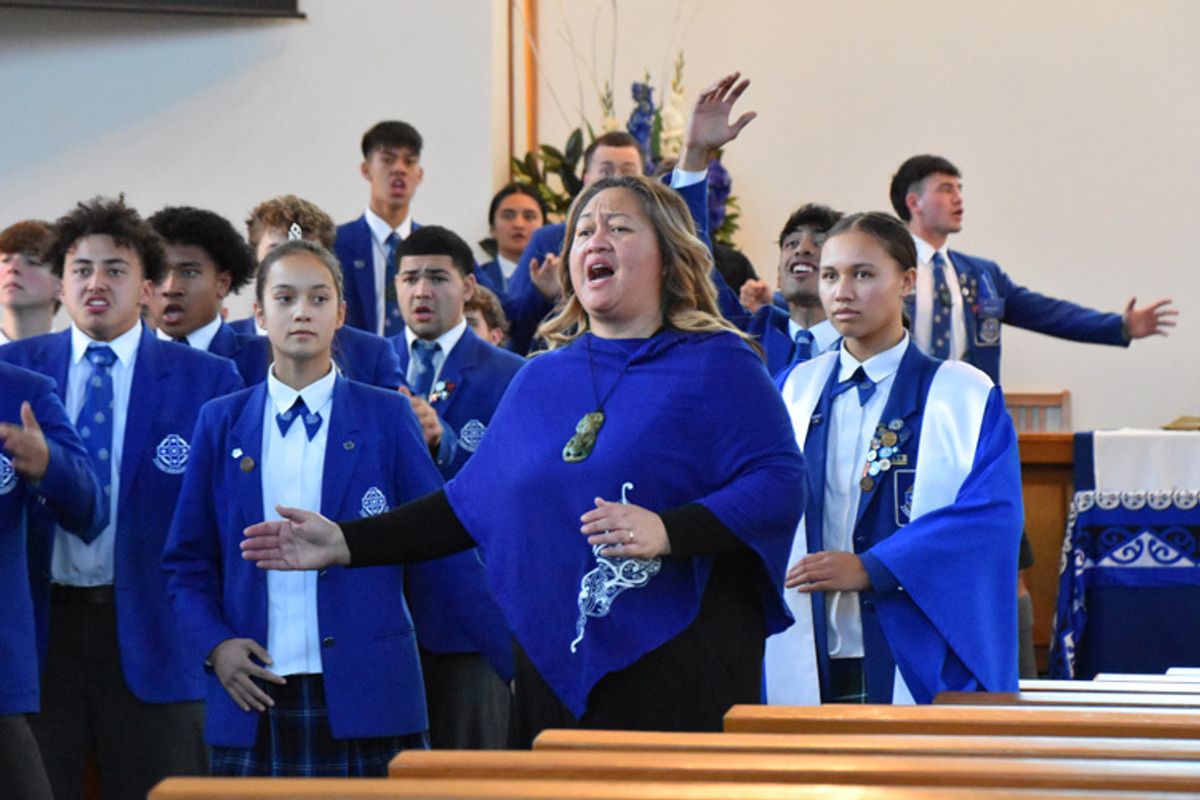 The service began with the resonating sound of the pūtatara (conch shell), blown by Sasha Croon, Year 13. This was immediately followed by a karanga, a welcome call to the visitors from Head Girl, J’adore Harris-Tavita, Year 10 student, Anamia Rangihaeta and staff member, Mrs Jasmine Martin. This was followed by a powerful haka powhiri led by Kazlo Evans, Year 13. The karakia timatanga, the opening prayer, was led by the Whatukura, Jade Stewart. Māreikura, Tanith Pilkington led the hīmene, the hymn, ‘Te Honore,’ sung by all present.