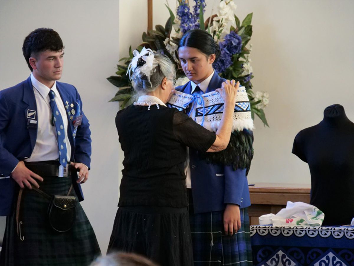 When the 2021 prefect team were commissioned at a special family ceremony at the start of the new academic year, Jade and Tanith were appointed to their new roles with korowai that had been loaned for the occasion. Yesterday, the prefects gathered once again, along with family members, for a special service to receive two korowai, Ngākau-nui and Rangimārie, especially woven and gifted to Saint Kentigern. Respected kuia and talented weaver, Mrs Tuaine Bailey said that Ngākau-nui refers to being ‘hearty, enthusiastic and diligent,’ whereas Rangimārie refers to being ‘quiet, peaceful, and humble.’ Both are complementary to each other, reinforcing Māori epistemology of duality.