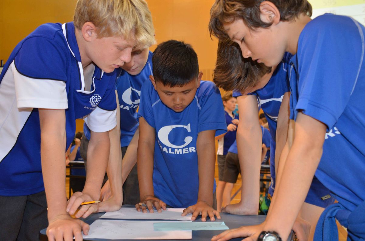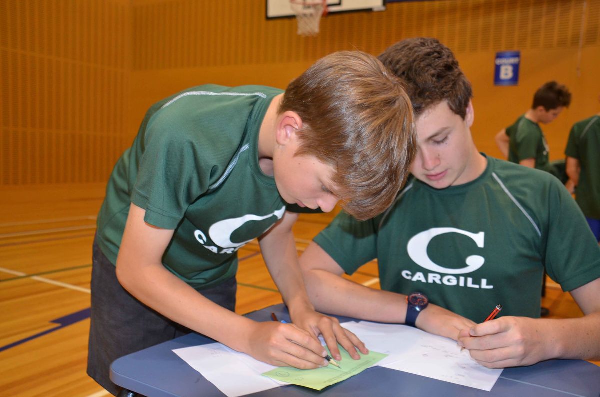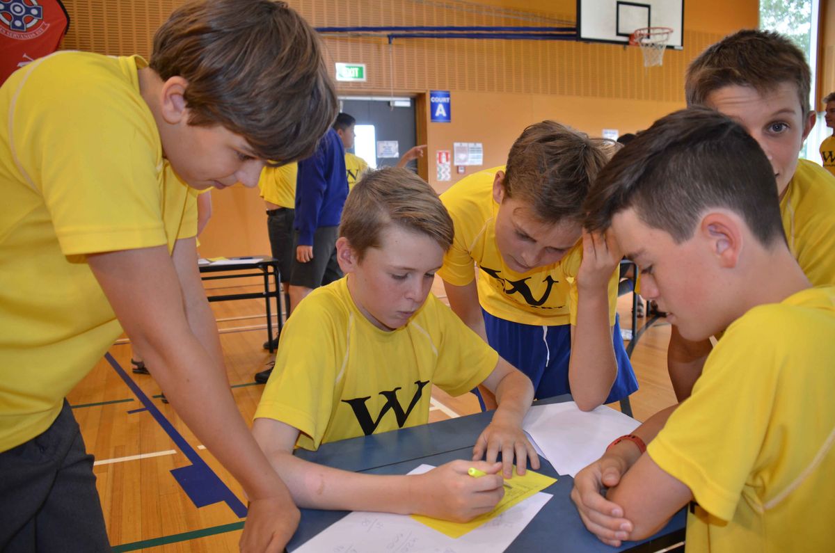 Fleet of foot and fleet of mind, the teams lined up from Years 4-8 to out-run and out-calculate each other in the annual House Mathex competition this morning. The event requires a small team to answer a set of 20 problem-solving questions correctly within the allocated time. There is a catch, this is a collaborative effort. One of the team is also assigned as a runner, to sprint back and forth to fetch the questions and return the answers to the front for marking; running a complete circuit to get there. Speed is of the essence – the huge stop watch is counting down the minutes right to the final second!