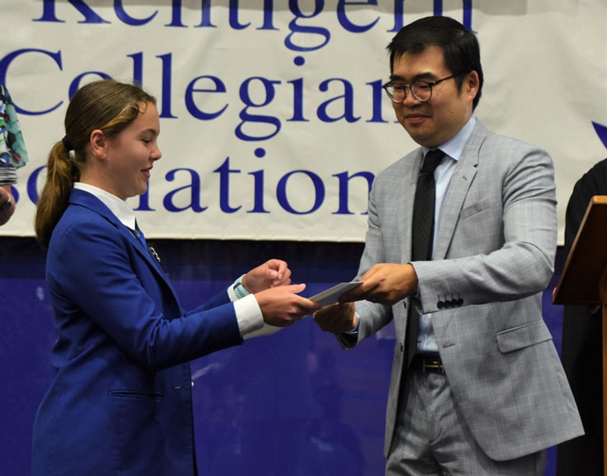 The Cameron Cups for Citizenship were awarded to Jade Nomani and Melody Lui-Webster for their worth contribution, and the Year 7 and 8 Menzies Cup for Citizenship was awarded to joint winners, Ricky Shen and Katelyn Quay-Chin. Cups were also awarded to Eva Melhuish and Ethan Agaimalo for showing ‘All-Round Ability’ throughout the year. The top honours of the morning went to Ethan Fung as Dux of the Middle College; a student who has attained significant academic and co-curricular achievement. Ethan thanked his friends, family and the Saint Kentigern staff before explaining his success wouldn’t have been possible without them. He concluded by encouraging the students to work together and support one another.