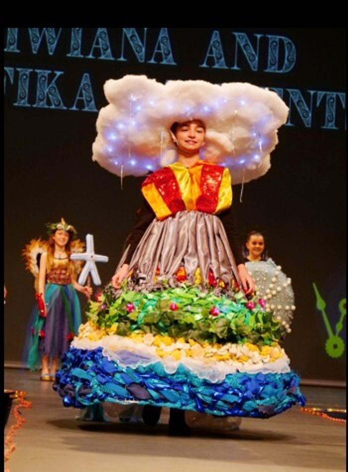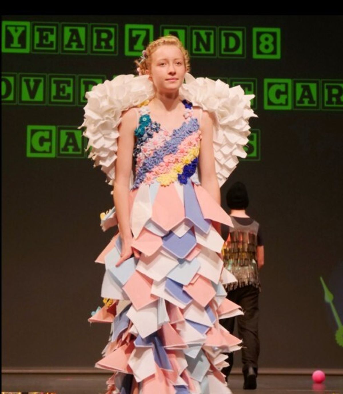 Last night, Saint Kentigern’s own ‘fashionistas’ stepped out on the catwalk for a spectacular show, as students in Years 7-10 confidently ‘strutted their stuff’ in in a range of ‘wearable art’ garments they had designed and constructed themselves. With over 60 costumes on show and each section introduced by a dance group, there were close to 200 Middle College students involved, with support from choreographers and dancers in Year 11. With generous prizes on offer across five categories, excitement was high, ticket sales were brisk and there wasn’t a spare seat in the house as an audience of almost 700 family members turned up in support!