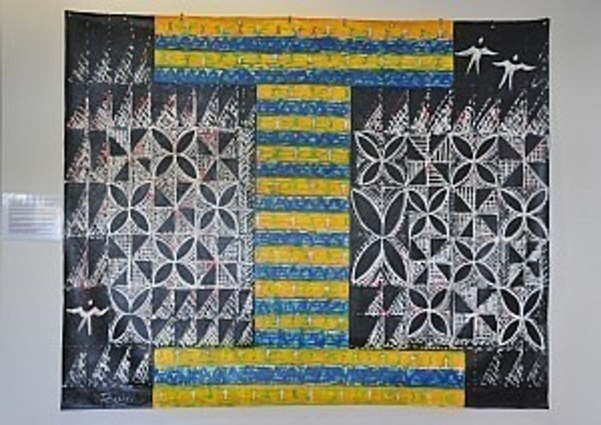 In the artwork Feu’u incorporates characteristic motifs such as the four petalled frangipani flower, the frigate bird, ceremonial masks, lava lava design, sails and cross hatching patterns. The cross hatching refers to lashing techniques which are frequently used to bind wood and stones when building dwellings or boats. The blue and yellow lava lava shape embraces and brings together all people. The criss-cross frangipani patterns are symbols of a rebirth and building process.