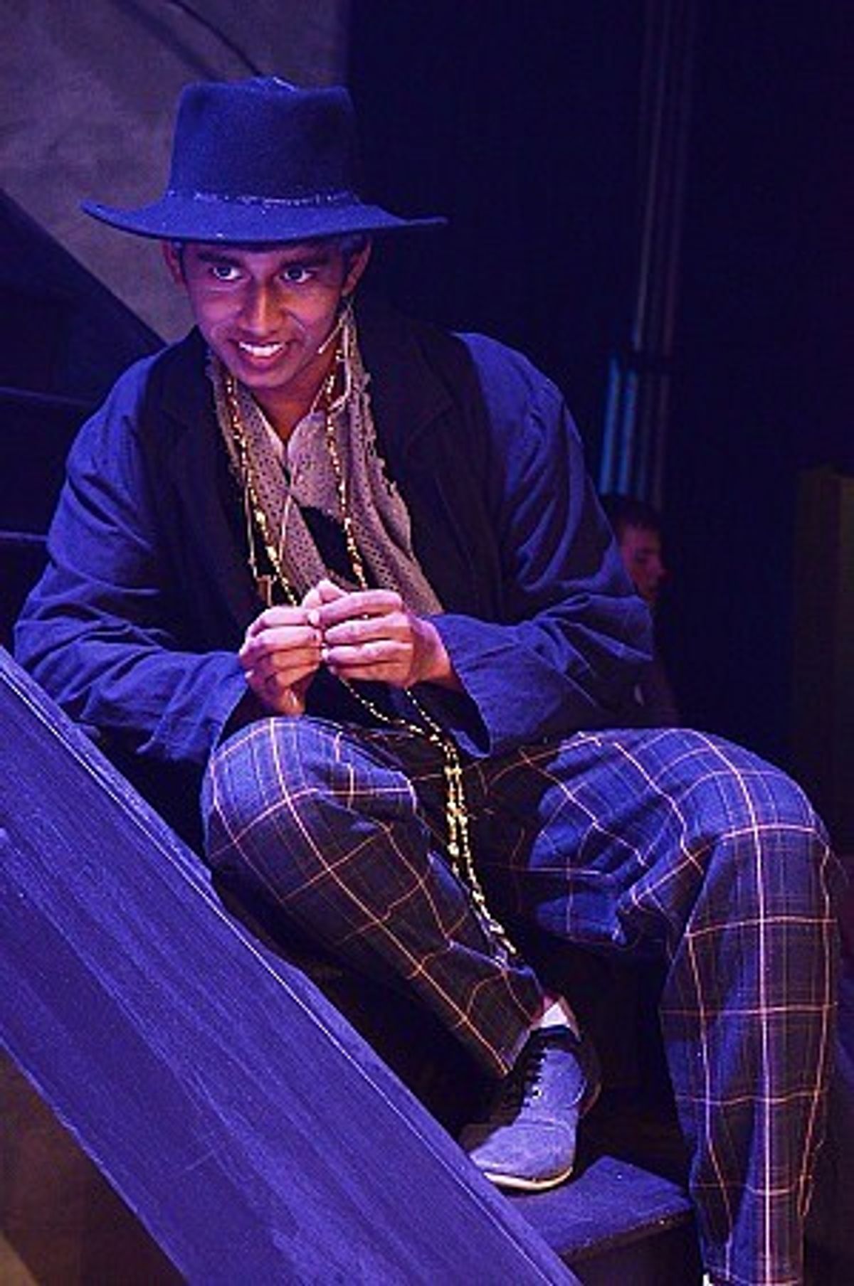 Escaping from the parlour and befriended by the supremely confident Artful Dodger (Luca Heard, Year 10), Oliver is invited to be ‘h’accommodated’ with Fagin and his gang. It is at this point that the show really opened up to reveal its heart. The set for Fagin’s kitchen was sparse, yet a homely riot of colour. Fagin’s gang of pickpockets were full of life and mischief, with their loot for the day strung up on lines across the set for added colour. Year 10 student, Sid Chand stooped and scurried in the miserly role of Fagin, giving us a convincing performance of an old man with dishonest, penny-pinching ways but with maybe just a touch of heart for his young charges. Sid’s superb singing voice, added immeasurably to his performance of this role.