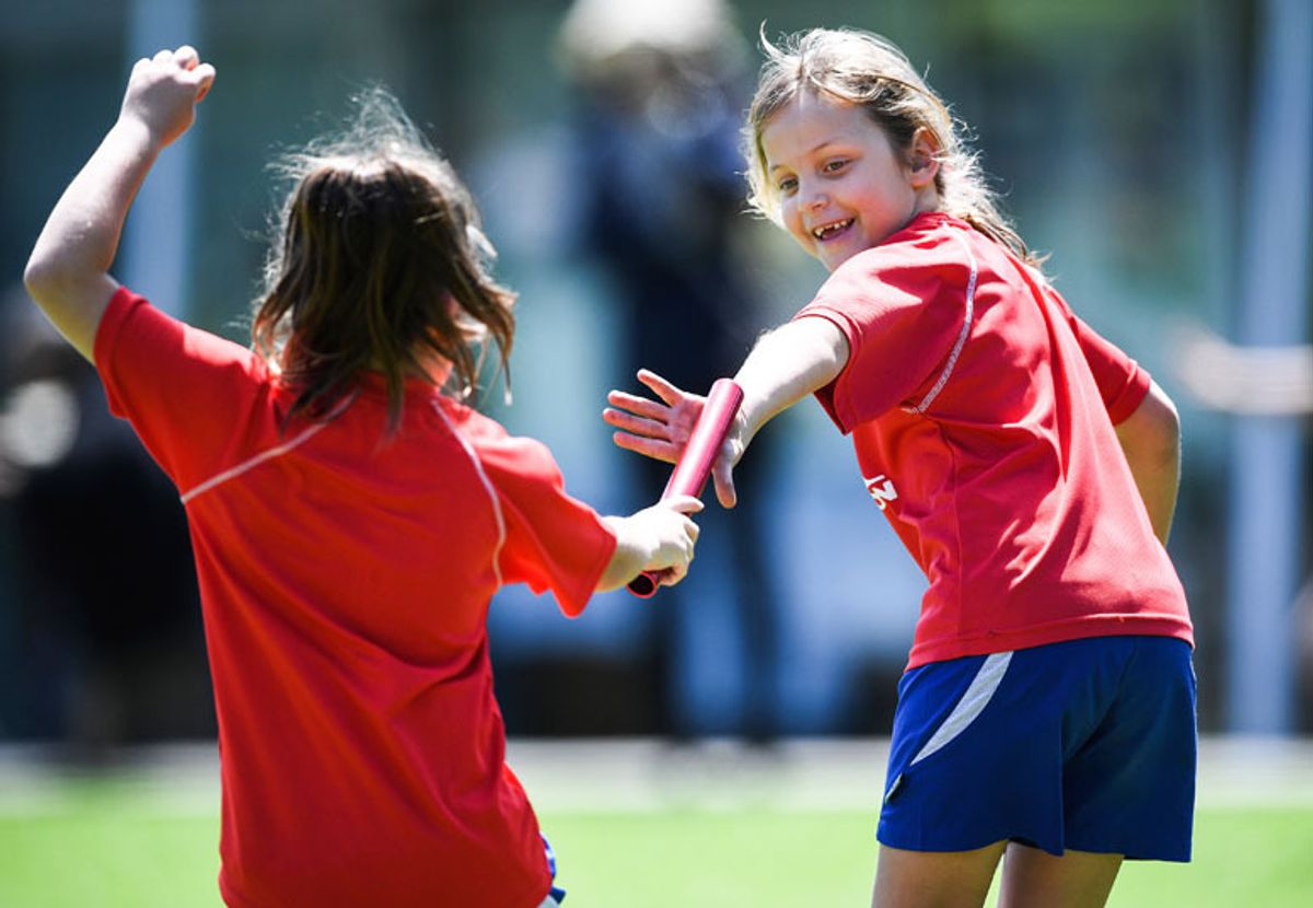 Chant, run, pass the baton, cheer. Chant, run, do the YMCA, cheer!