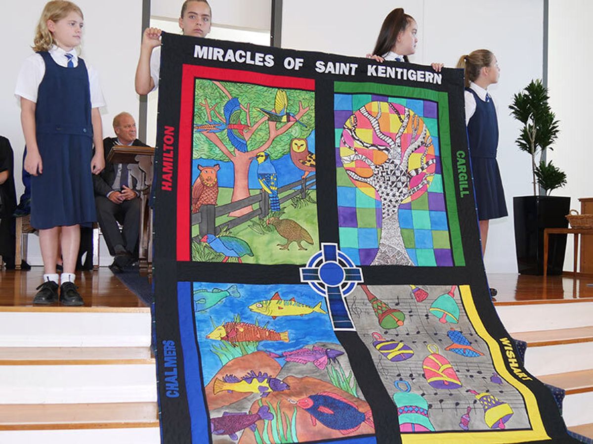 Working in small groups within their year level, the girls were each responsible for a section of the banner. Each panel depictS one of the four miracles that Saint Kentigern performed during his life.