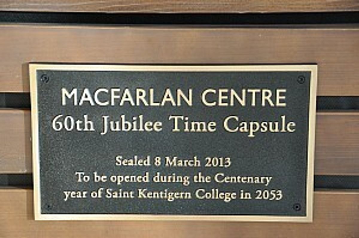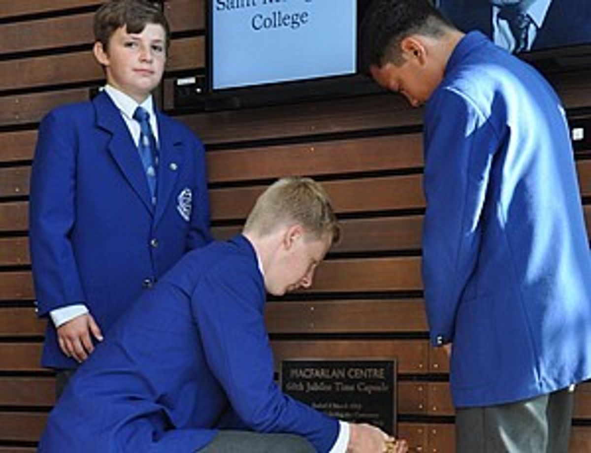 The project of choosing and preparing the materials for the capsule was undertaken in 2012 by a small group of Year 8 students (Ryan Barrett, Alex MacDonald, Nathan Oddy and Vili Sipa) who chose to include a number of different items related to the year in which the MacFarlan Centre was built. The precise nature of the contents will be left to a succeeding generation to discover in 2053, the centennial year of the College, but they will find both published and digital material as well as some College artifacts.