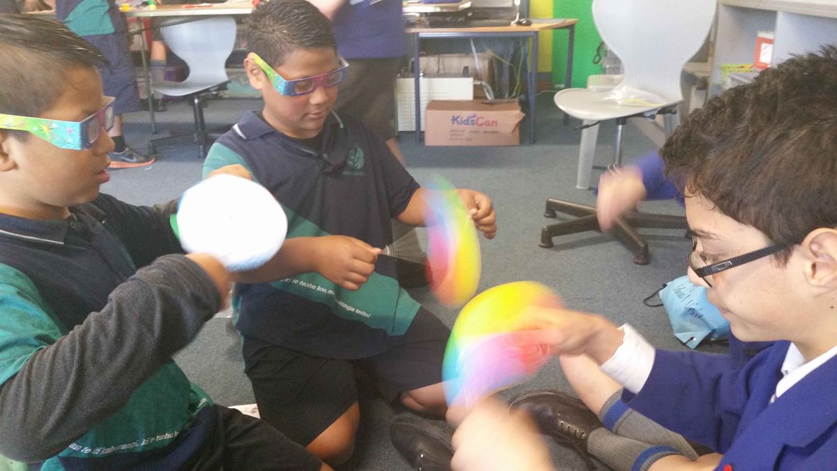 Armed with coloured paper, card and string to make colour wheels, our boys set out to demonstrate to the younger students how the white light from the sun is made up of several frequencies of colour. When the colour wheels are spun very quickly, all the colours merge together to become white - not a result that most would predict. To top the lesson off, the Saint Kentigern students gave the Rongomai students a pair of refraction glasses which splits the white light up into the different frequencies to show the colours of the rainbow.