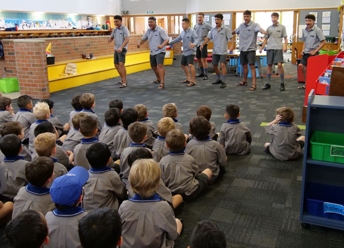 Towering over their Boys’ School hosts, a group of Year 10 boys from the College, accompanied by Matua Maurice Nelson, visited the Junior School at the Shore Road campus yesterday to share their love of Te Reo.