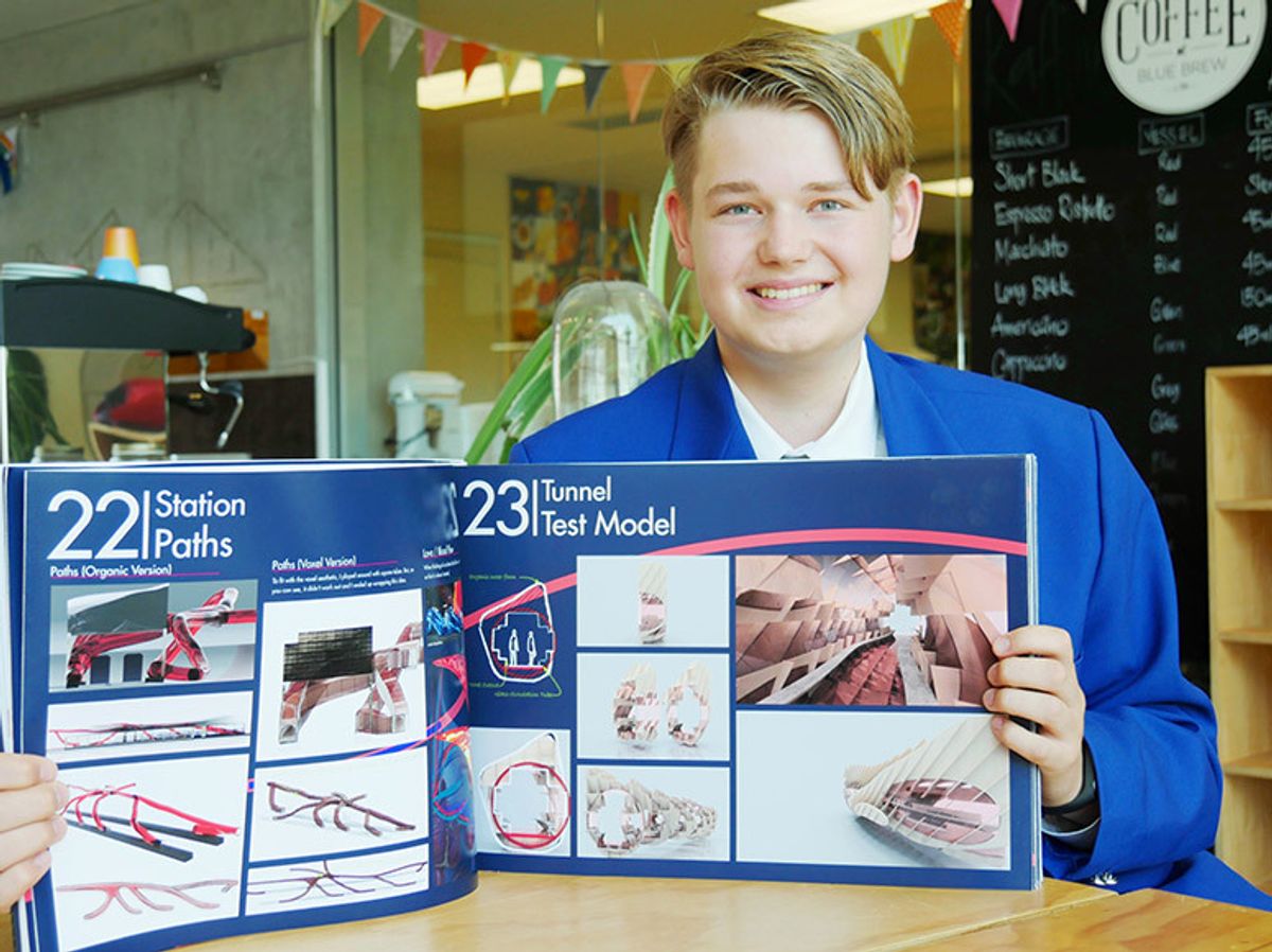 The NCEA Level 3 Spatial Design programme is set up so students choose their own design context and work on developing and presenting a design outcome throughout the whole year. A key to Christopher's success was working within a context that combined his passion for trains with architecture - his brief was to develop a new train station design to replace the existing one at his local train station, Meadowbank.
