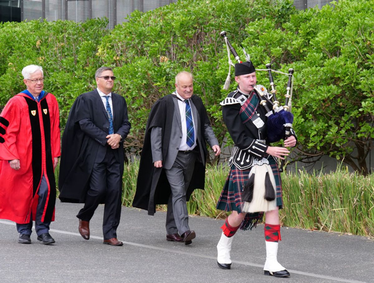 Year 12 student, Cameron Dean, had the honour of piping Mr Brooke, along with the Chairman of the Trust Board, Dr John Kernohan and Head of Saint Kentigern, Mr David Hodge to the Sports Centre, where the students and staff waited to greet him.