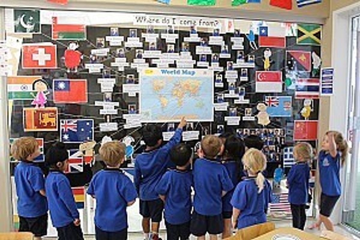 Our children and staff at Preschool represent 25 nationalities! The cultural mix is a strength of our programme and our children thrive on the friendships they build. Our recent ‘Centre of Interest’ on ‘Where Am I From’ saw a world map displayed with each child’s photo represented under the countries both their parents and they were born in. Flags of each country and artwork of traditional costumes drawn by the children completed the wall.