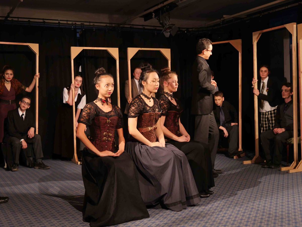 The entire class was onstage throughout the play, with four students playing the lead character in turn. The costumes were chosen to reflect the Gothic nature of the play, adding a degree of ‘menace.’ It was the stark staging that had the greatest impact as eleven door frames constantly moved and regrouped to become doorways, corridors, a rocking boat and a variety of other scenes from K’s life and imagination.