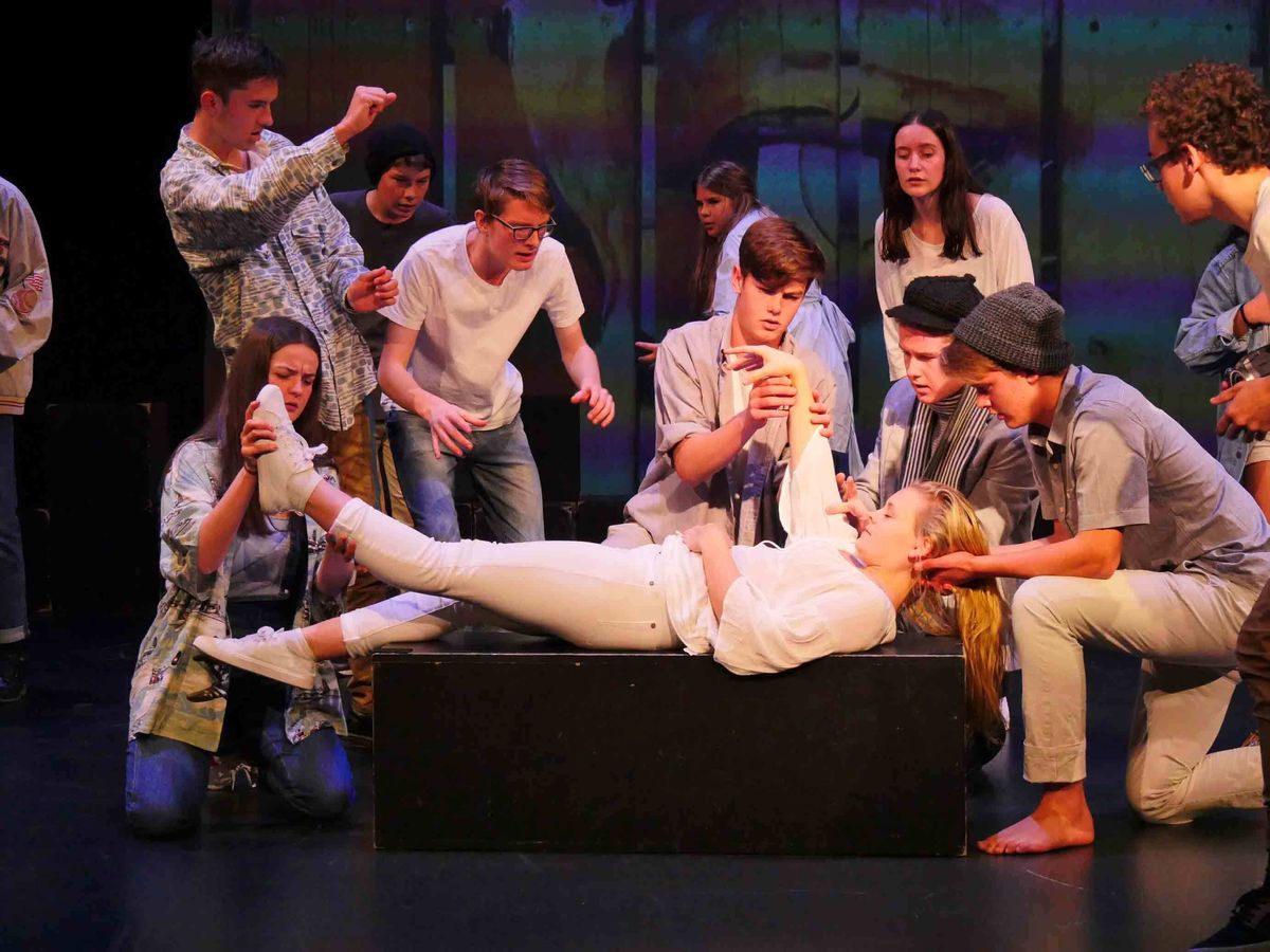 Miss Wilson’s class focussed on Physical Theatre and chorus of movement to explore the characters’ subtext, which was often deliberately at odds with the persona they were presenting. In Physical Theatre, the use of movement is emphasised as an important form of expressive communication.